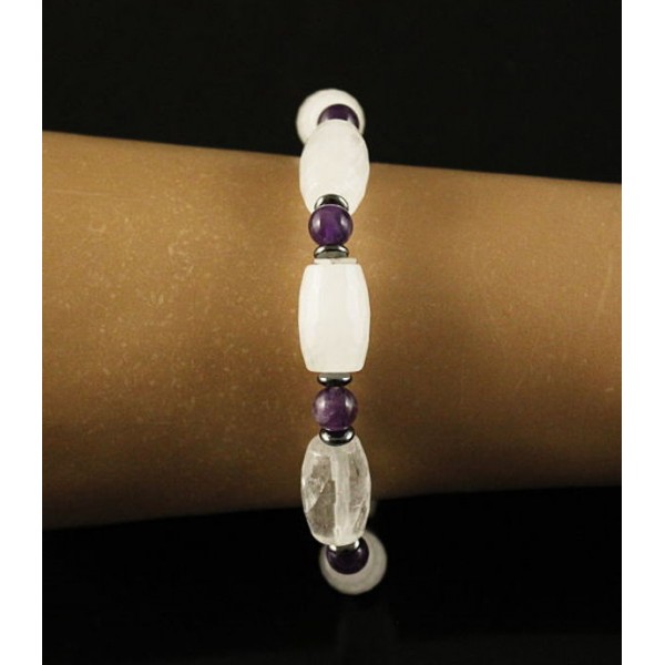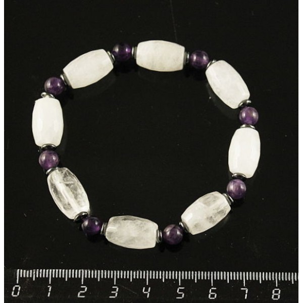 Браслет горный хрусталь (бочонок), аметист (шарик), гематит (рондель)