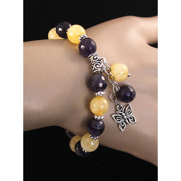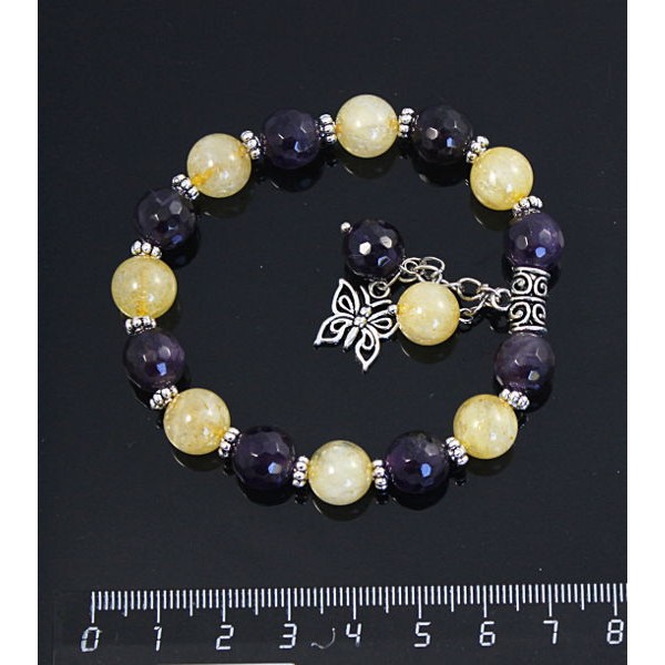 Браслет из аметиста (огранка) и цитрина, шарик 9-10мм, с подвеской