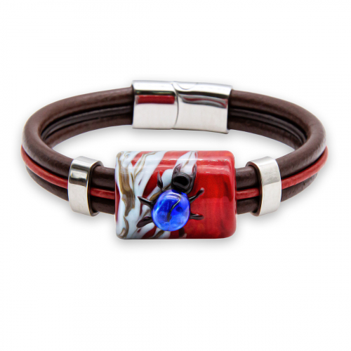 Браслет изготовлен из муранского стекла, натуральной кожи и гипоаллергенной ювелирной стали, что очень важно для людей с чувствительной кожей. Металл не темнеет и не подвергается воздействиям окружающей среды, надолго обеспечивая красивый внешний вид изделия. Крепкий магнитный замок с двойной защитой надежно фиксируется на запястье. Ширина браслета - 1,5 см. Размер стеклянной бусины - 1,9x2,5 см. Вес - 27 гр.