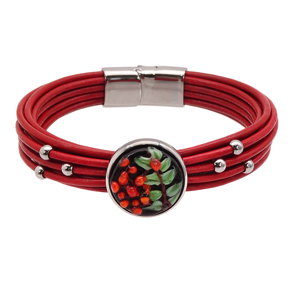 Браслет изготовлен из муранского стекла, натуральной кожи и гипоаллергенной ювелирной стали, что очень важно для людей с чувствительной кожей. Металл не темнеет и не подвергается воздействиям окружающей среды, надолго обеспечивая красивый внешний вид изделия. Крепкий магнитный замок с двойной защитой надежно фиксируется на запястье. Ширина браслета - 1,5 см. Диаметр стеклянного элемента - 2 см. Вес - 24 гр.