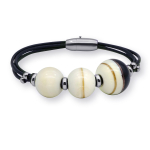 Браслет изготовлен из муранского стекла, натуральной кожи и гипоаллергенной ювелирной стали, что очень важно для людей с чувствительной кожей. Металл не темнеет и не подвергается воздействиям окружающей среды, надолго обеспечивая красивый внешний вид изделия. Крепкий магнитный замок с двойной защитой надежно фиксируется на запястье. Ширина браслета - 0,5 см. Размер стеклянных бусин - 1,4х1,4 и 1,1х1,1 см. Вес - 15 гр.