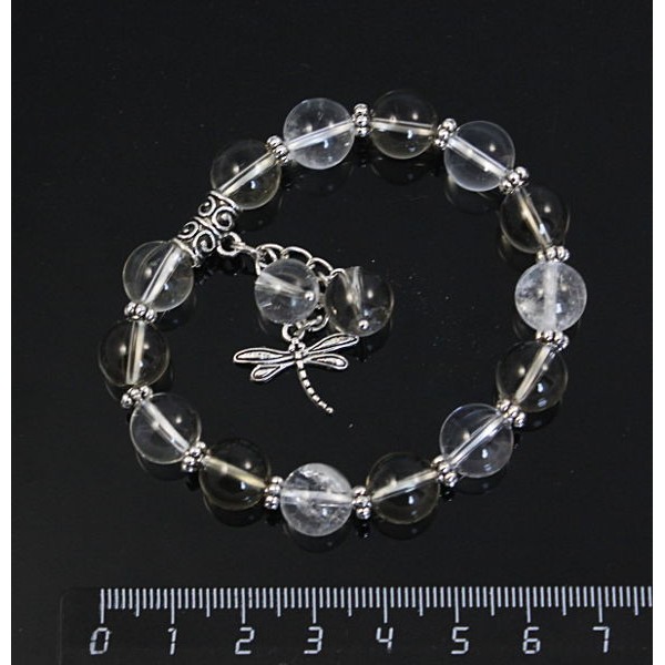 Браслет из раухтопаза и горного хрусталя, шарик 10мм гладкий, с подвесками