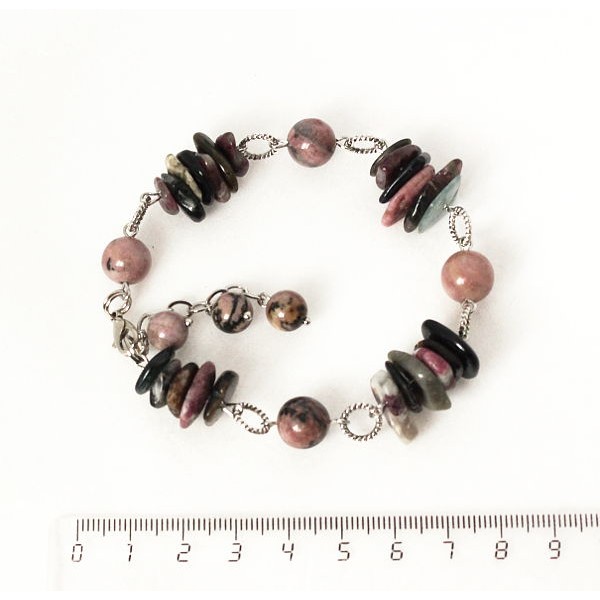 Браслет из турмалина (крупная плоская галтовка) и родонита (шарик 8 и 10мм), на колечках