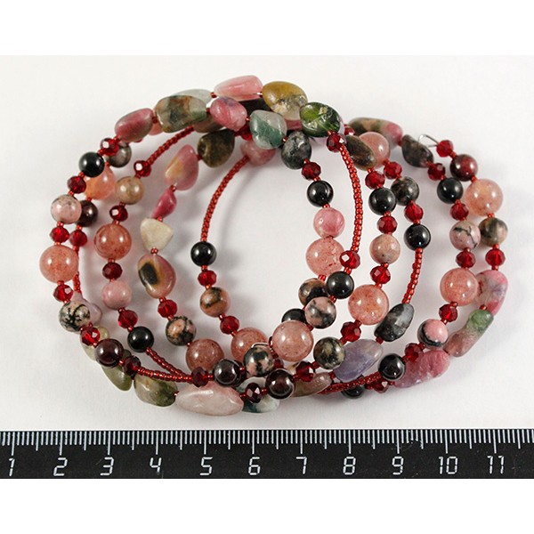Браслет на струнке турмалин (овалы), родонит, гранат, кварц земляничный (шарики) + хрусталь, 5-6 оборотов