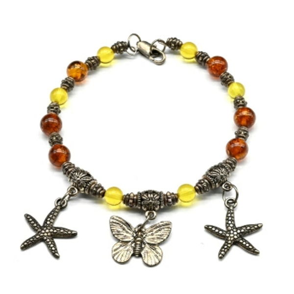 Браслет с янтарем и Кулонами шарик 6мм, 7мм цвет лимонный, коньячный, 18см