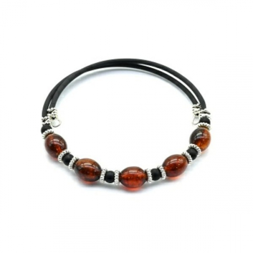 Браслет с янтарем на витом шнурке цв.разный, шарик 14мм коньячный, 22см