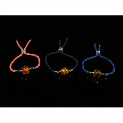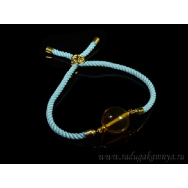 Браслет с янтарем на витом шнурке голубом, шарик 14мм медовый, 22см