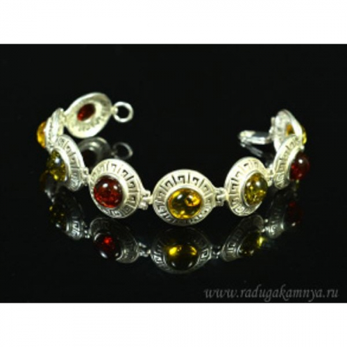 Браслет с янтарём в посеребрении "греческий" круг 18мм ассорти, 19см