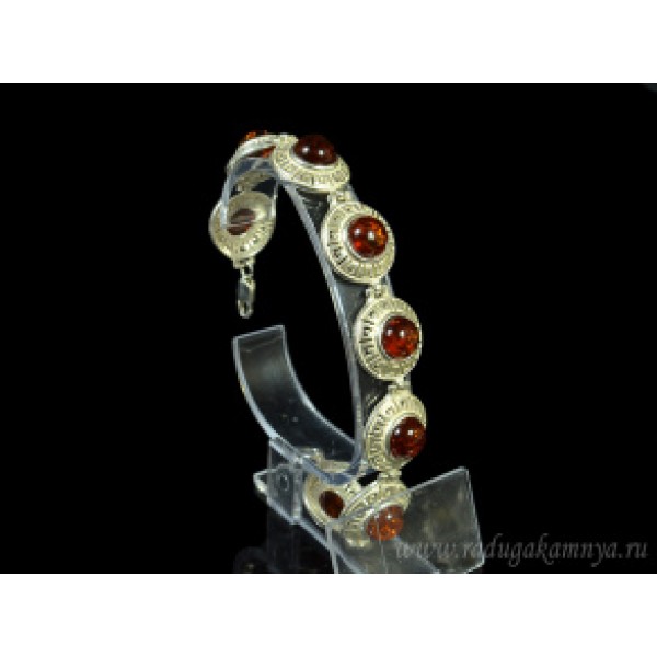 Браслет с янтарём в посеребрении "греческий" круг 18мм коньячный, 18,5см