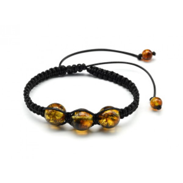 Браслет шамбала с 3 шариками 14мм из янтаря цвет коньячно-зеленый, 16см