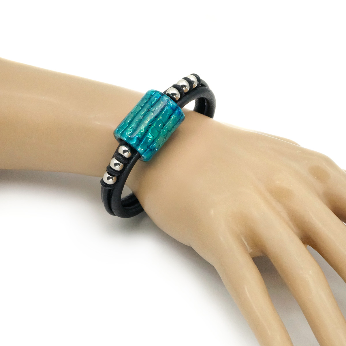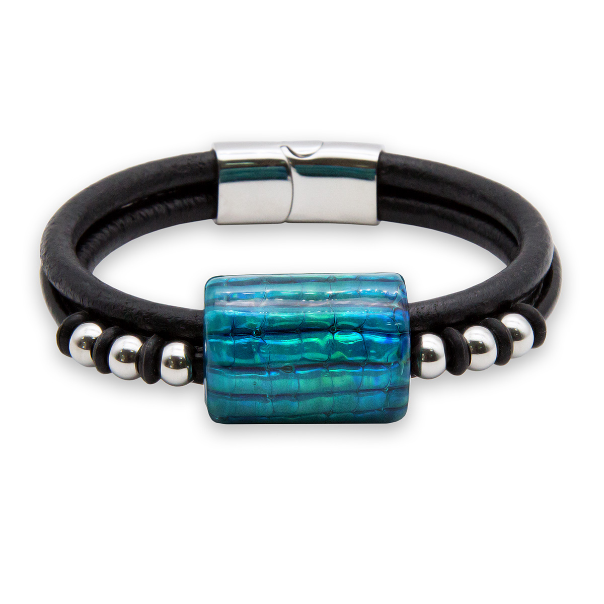 Браслет изготовлен из муранского стекла, натуральной кожи и гипоаллергенной ювелирной стали, что очень важно для людей с чувствительной кожей. Металл не темнеет и не подвергается воздействиям окружающей среды, надолго обеспечивая красивый внешний вид изделия. Крепкий магнитный замок с двойной защитой надежно фиксируется на запястье. Ширина браслета - 1,5 см. Размер стеклянной бусины - 1,9x2,5 см. Вес - 30 гр.