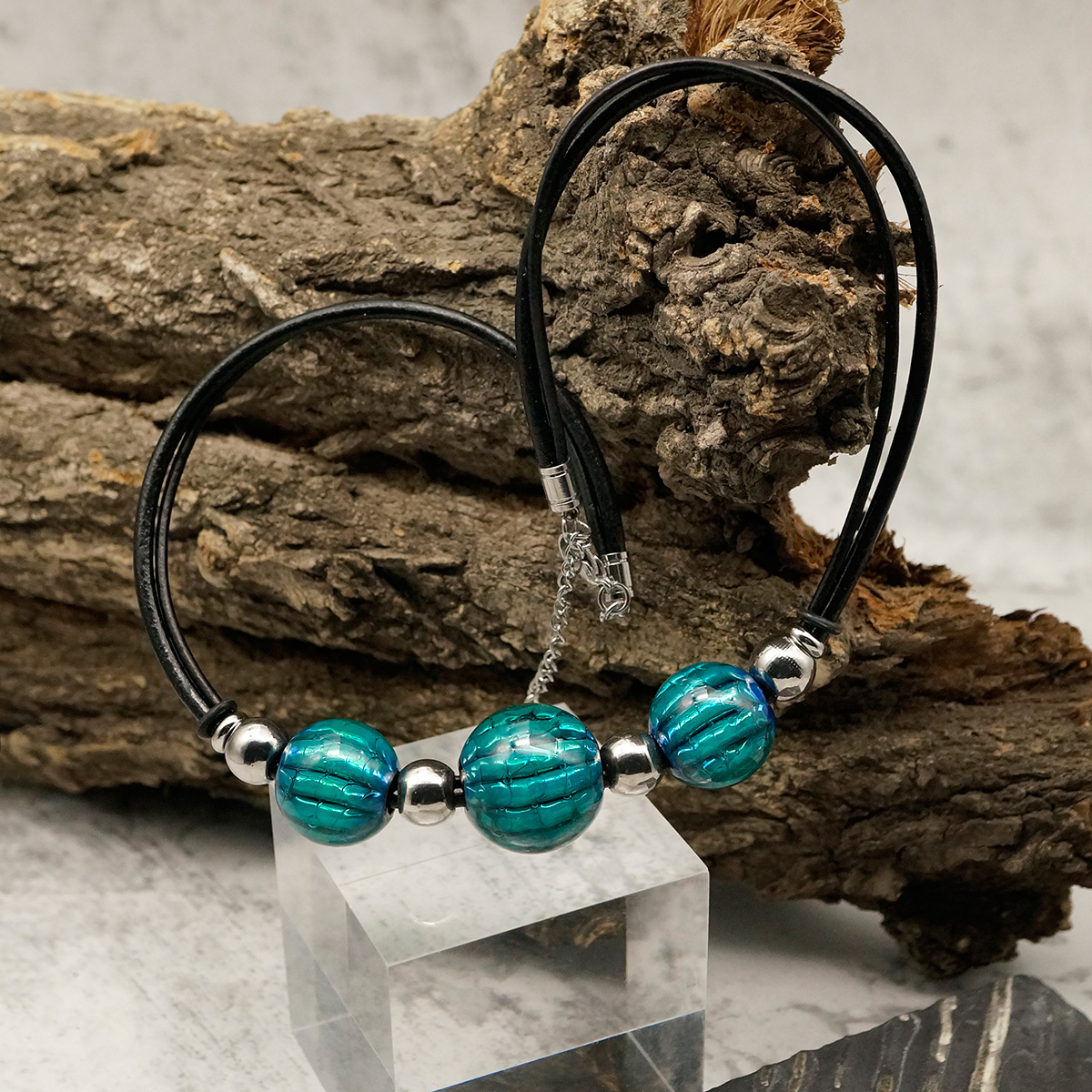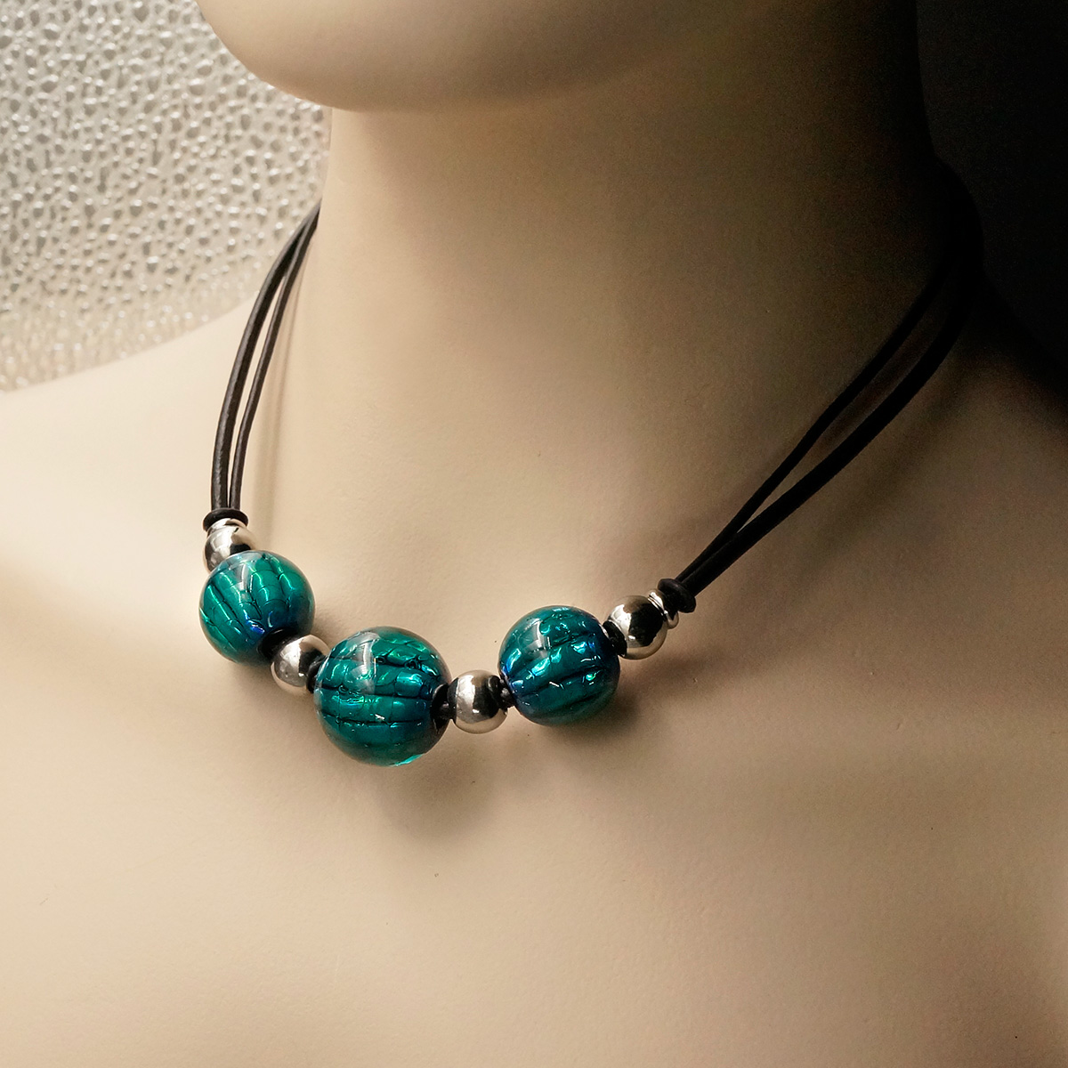 Колье изготовлено из натуральной кожи, муранского стекла и гипоаллергенной ювелирной стали, что очень важно для людей с чувствительной кожей. Металл не темнеет и не подвергается воздействиям окружающей среды, надолго обеспечивая красивый внешний вид изделия. Длина колье - 46 см + 5 см. удлиняющая цепочка. Диаметр шаров - 1,8 и 2,2 см. Вес - 46 гр.