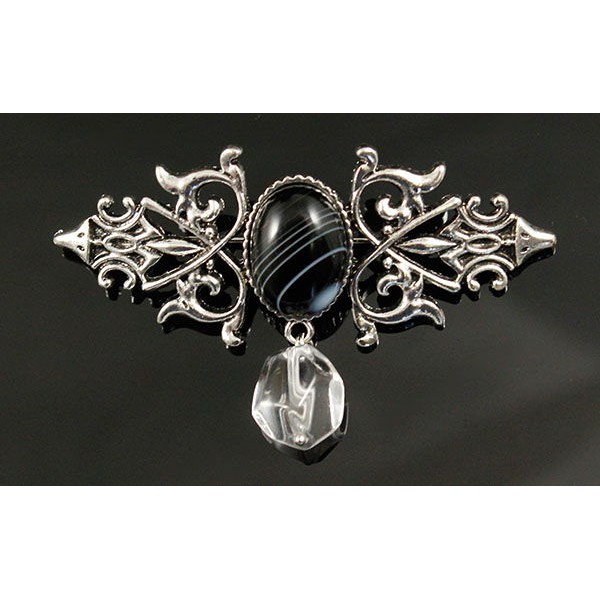 Брошь из агата черного "вензель", основа 70х2.4мм, овал 18х13мм, подвеска горный хрусталь