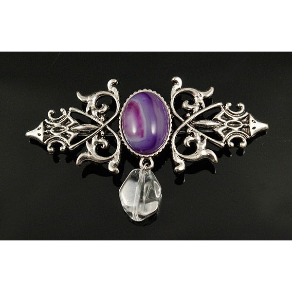 Брошь из агата фиолетового (тонир.) "вензель", основа 70х2.4мм, овал 18х13мм, подвеска горный хрусталь
