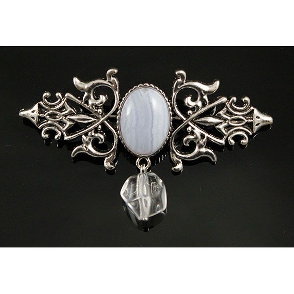 Брошь из агата голубого (сапфирин) "вензель", основа 70х2.4мм, овал 18х13мм, подвеска горный хрусталь