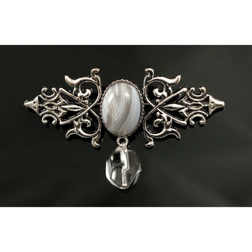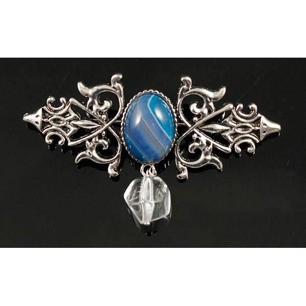 Брошь из агата синего (тонир.) "вензель", основа 70х2.4мм, овал 18х13мм, подвеска горный хрусталь