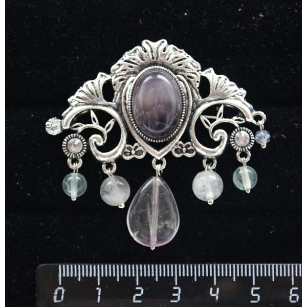 Брошь из аметиста "трюмо", овал 18х13мм, со стразами и подвесками из флюорита