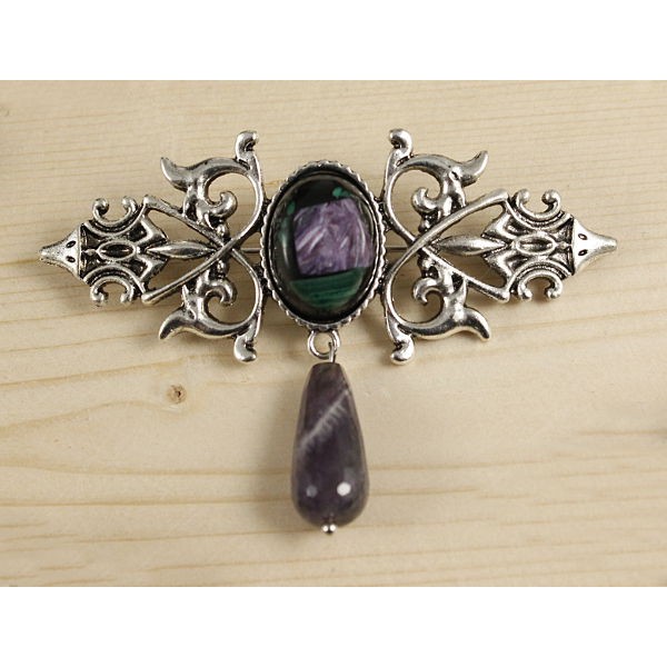 Брошь из чароита и малахита (кабошон-мозаика) "вензель", основа 70х2.4мм, овал 18х13мм, подвеска аметист
