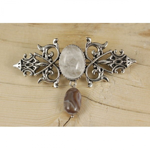 Брошь из горного хрусталя "вензель", основа 70х2.4мм, овал 18х13мм, подвеска агат черный