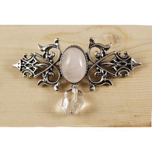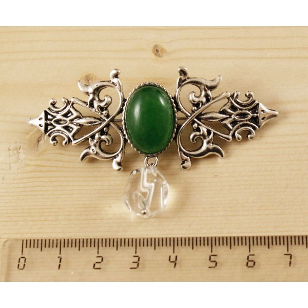 Брошь из кварца (цвет хризопраз) "вензель", основа 70х2.4мм, овал 18х13мм, подвеска горный хрусталь