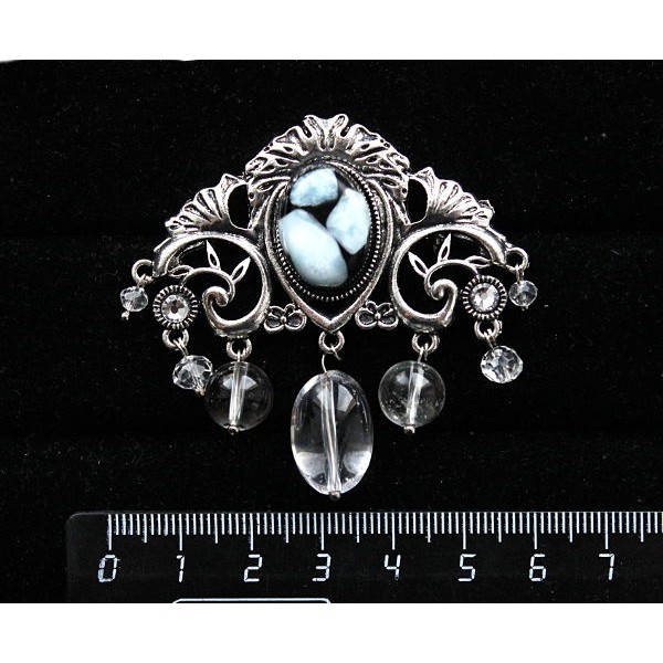 Брошь из ларимара (кабошон-мозаика) "трюмо", овал 18х13мм, со стразами и подвесками из горного хрусталя