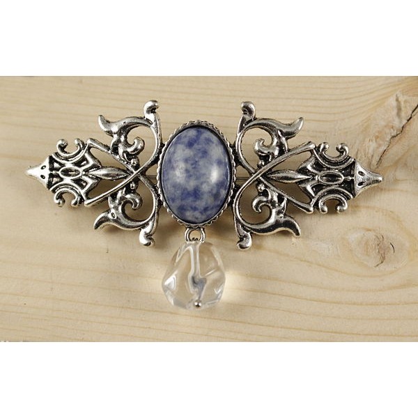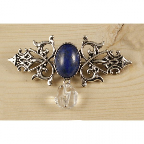 Брошь из лазурита (бело-синий) "вензель", основа 70х2.4мм, овал 18х13мм, подвеска горный хрусталь