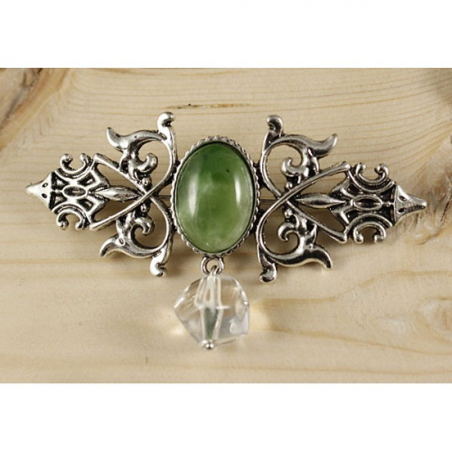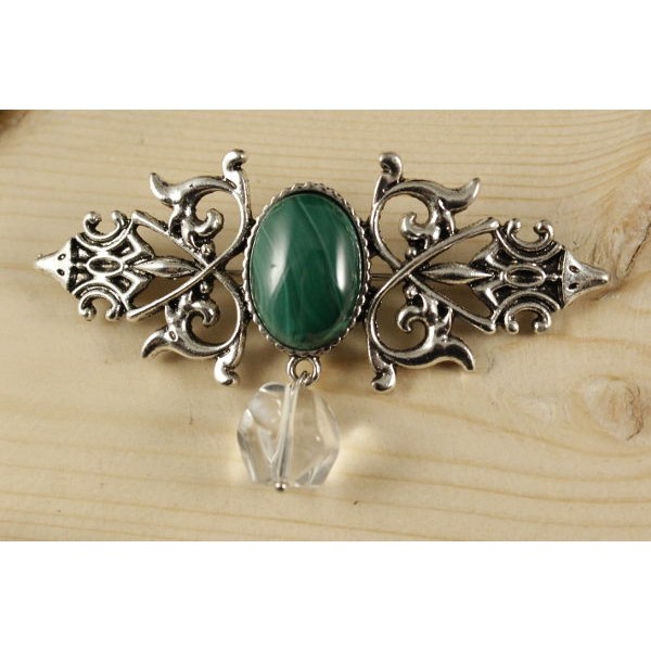Брошь из малахита "вензель", основа 70х2.4мм, овал 18х13мм, подвеска горный хрусталь