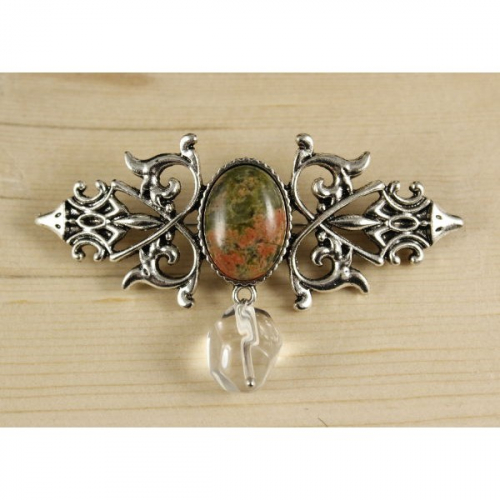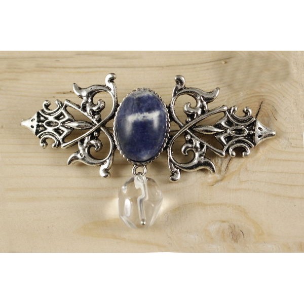 Брошь из содалита "вензель", основа 70х2.4мм, овал 18х13мм, подвеска горный хрусталь