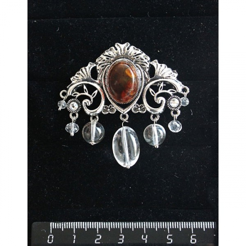 Брошь из унакита "вензель", основа 70х2.4мм, овал 18х13мм, подвеска горный хрусталь