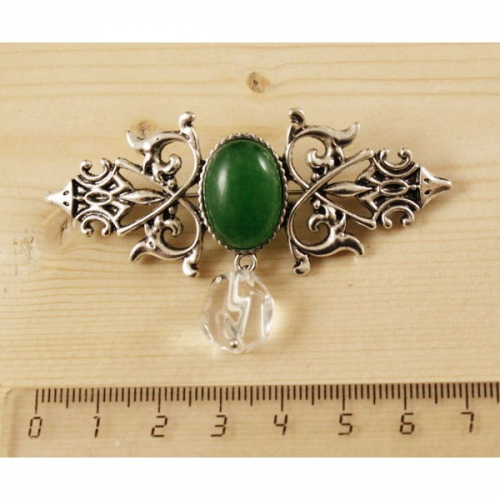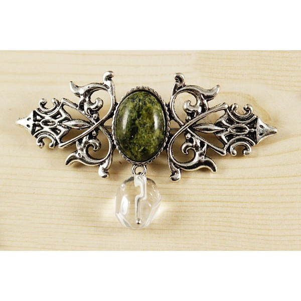 Брошь из змеевика "вензель", основа 70х2.4мм, овал 18х13мм, подвеска горный хрусталь