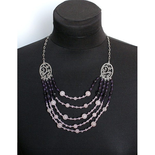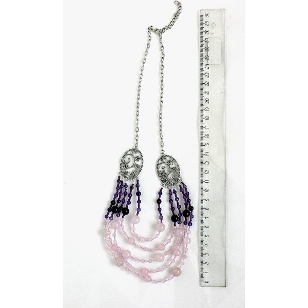 Бусы из кварца розового и аметиста "5 нитей", коннектор "плющ"
