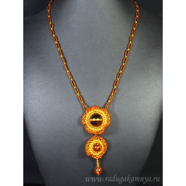 Бусы с подвеской из янтаря с бисером "Омелия" коньячый, 51см