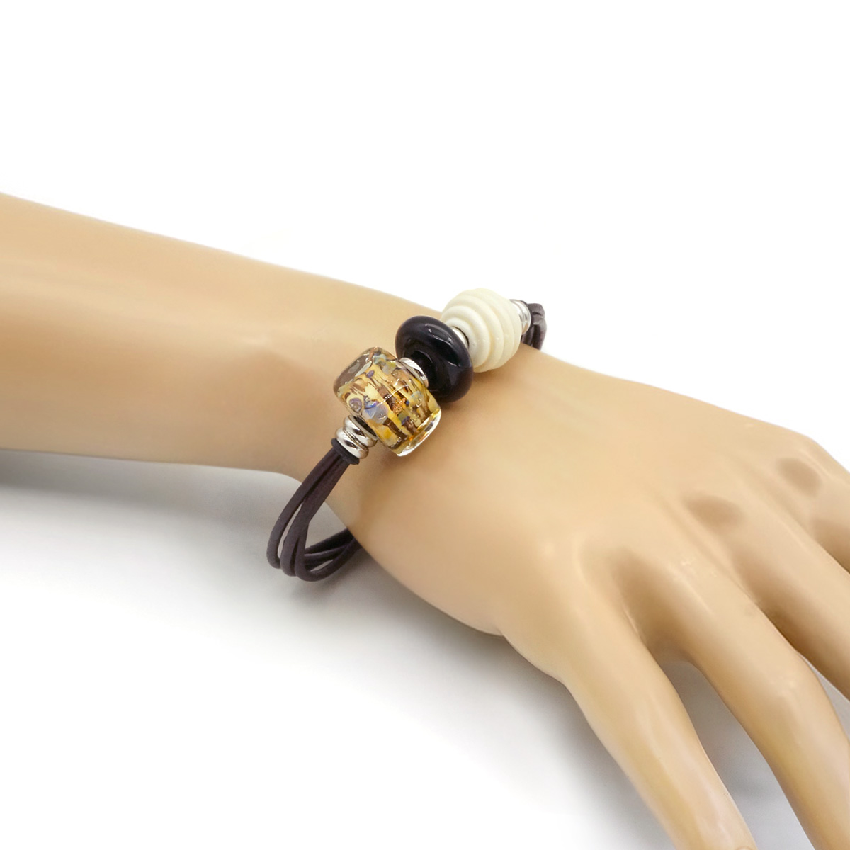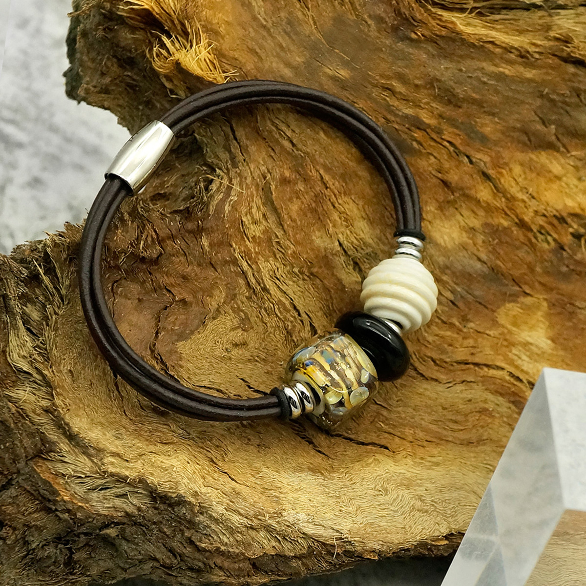 Браслет изготовлен из муранского стекла, натуральной кожи и гипоаллергенной ювелирной стали, что очень важно для людей с чувствительной кожей. Металл не темнеет и не подвергается воздействиям окружающей среды, надолго обеспечивая красивый внешний вид изделия. Крепкий магнитный замок надежно фиксируется на запястье. Ширина браслета - 0,5 см. Диаметр стеклянных элементов 1,5 и 1,8 см. Рондели 1,4х0,5. Вес -25 гр.