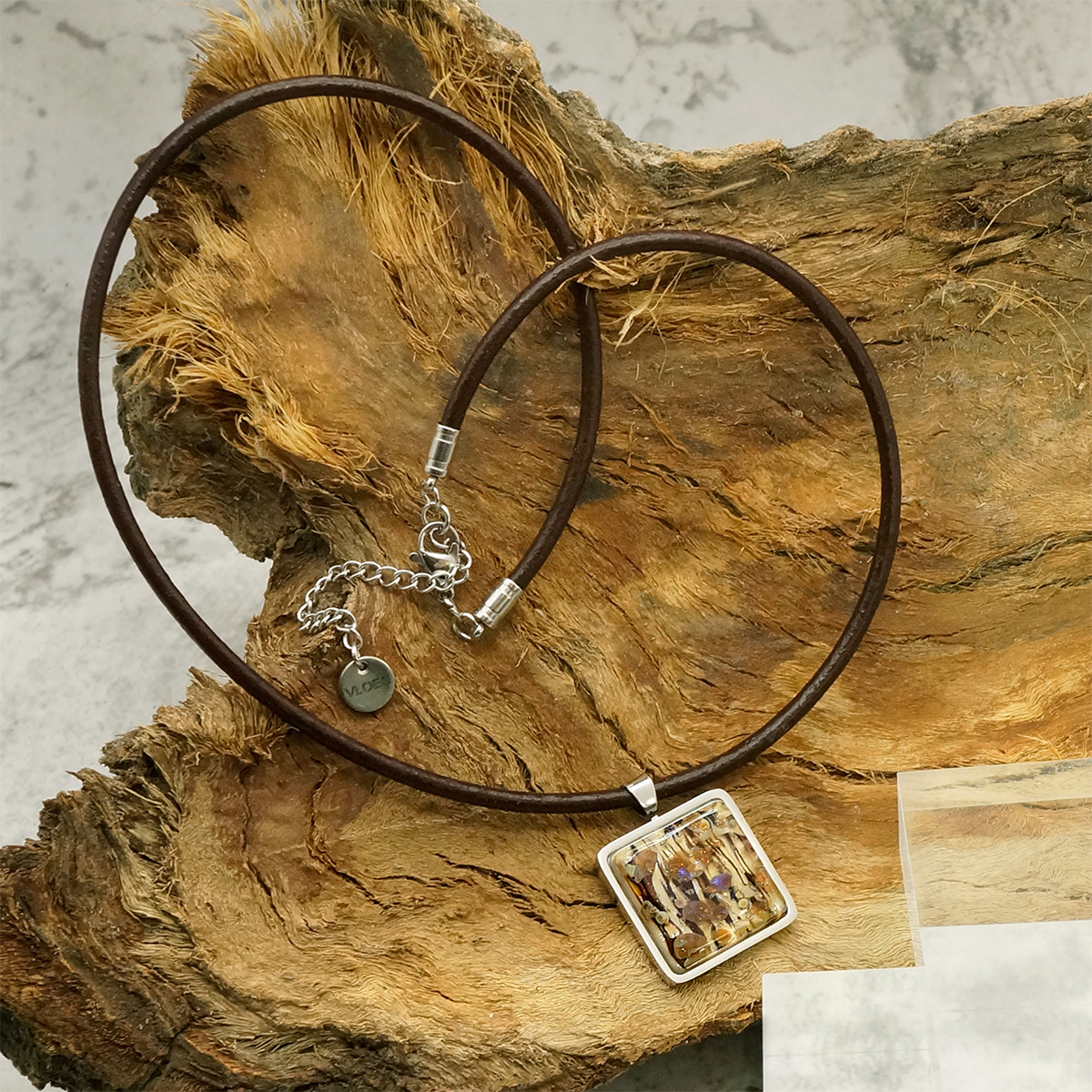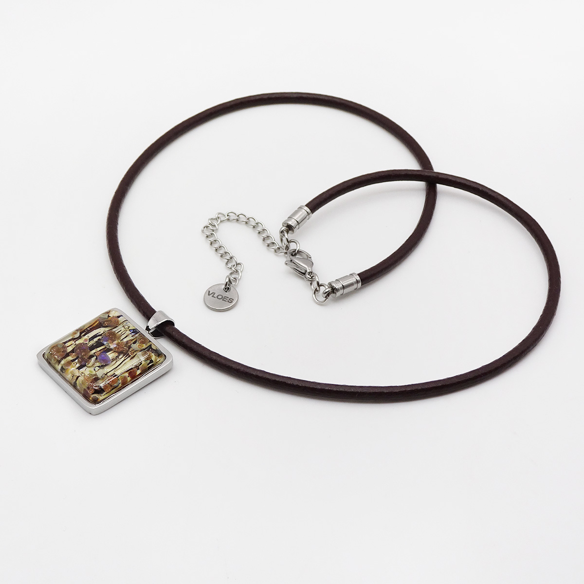 Колье изготовлено из натуральной кожи, муранского стекла и гипоаллергенной ювелирной стали, что очень важно для людей с чувствительной кожей. Металл не темнеет и не подвергается воздействиям окружающей среды, надолго обеспечивая красивый внешний вид изделия. Длина колье - 46 см + 5 см. удлиняющая цепочка. Размер стеклянного элемента - 2,2х2,2 см.  Вес - 18 гр.