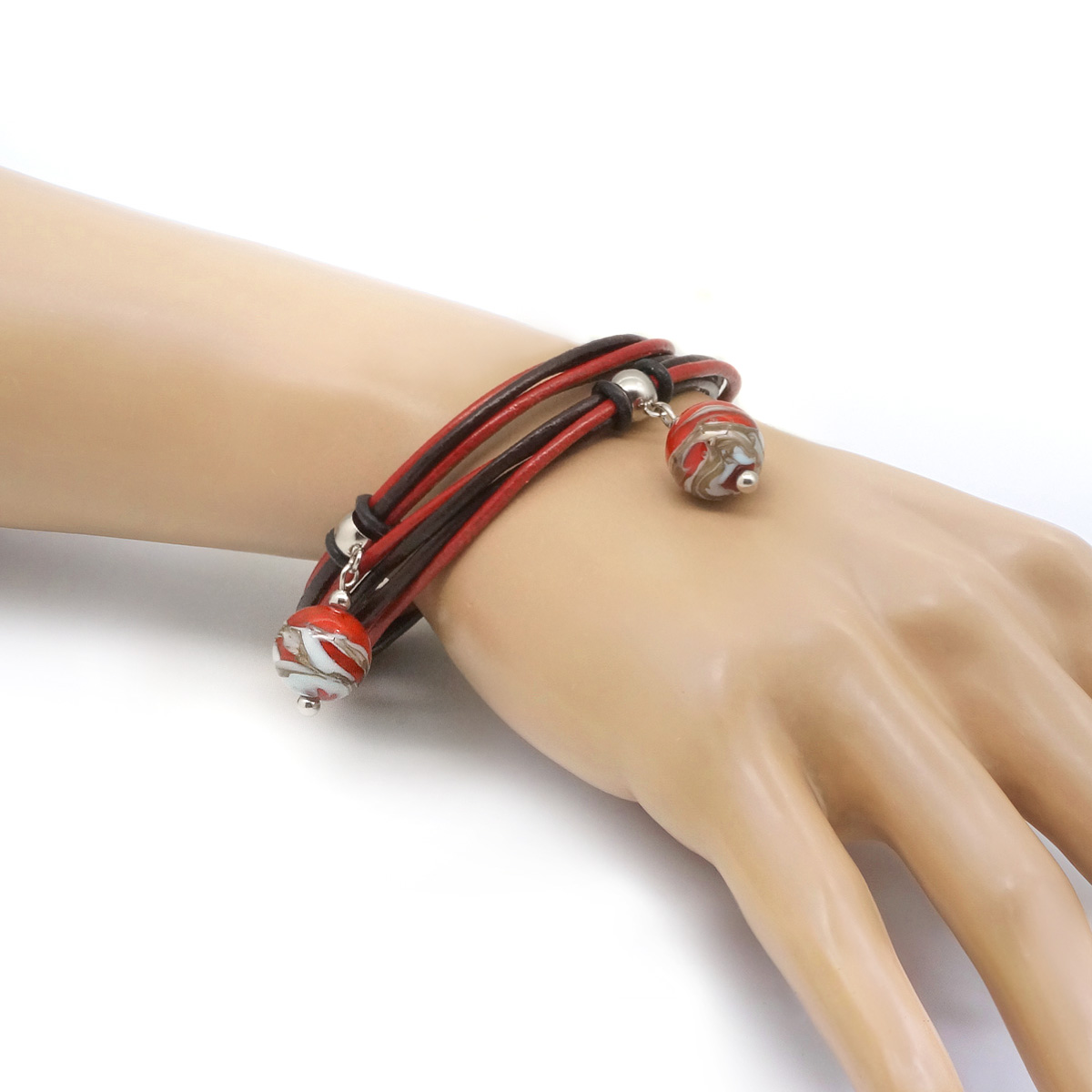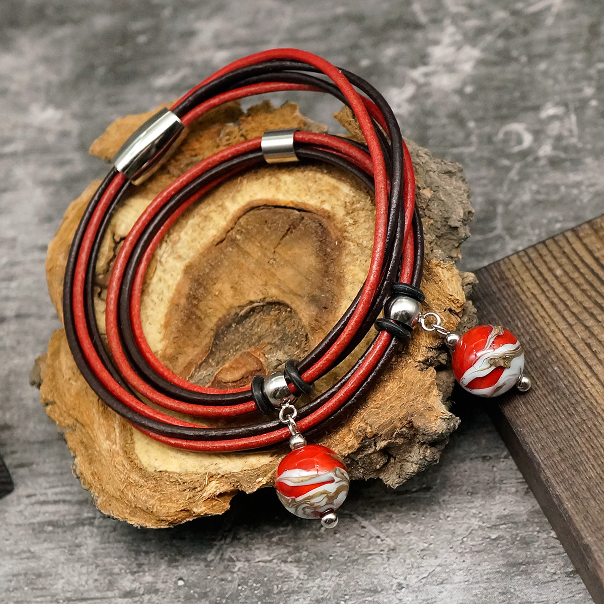 Браслет изготовлен из муранского стекла, натуральной кожи и гипоаллергенной ювелирной стали, что очень важно для людей с чувствительной кожей. Металл не темнеет и не подвергается воздействиям окружающей среды, надолго обеспечивая красивый внешний вид изделия. Крепкий магнитный замок надежно фиксируется на запястье. Ширина браслета - 1 см. Диаметр стеклянного шарика - 1,2 см. Вес - 13 гр.