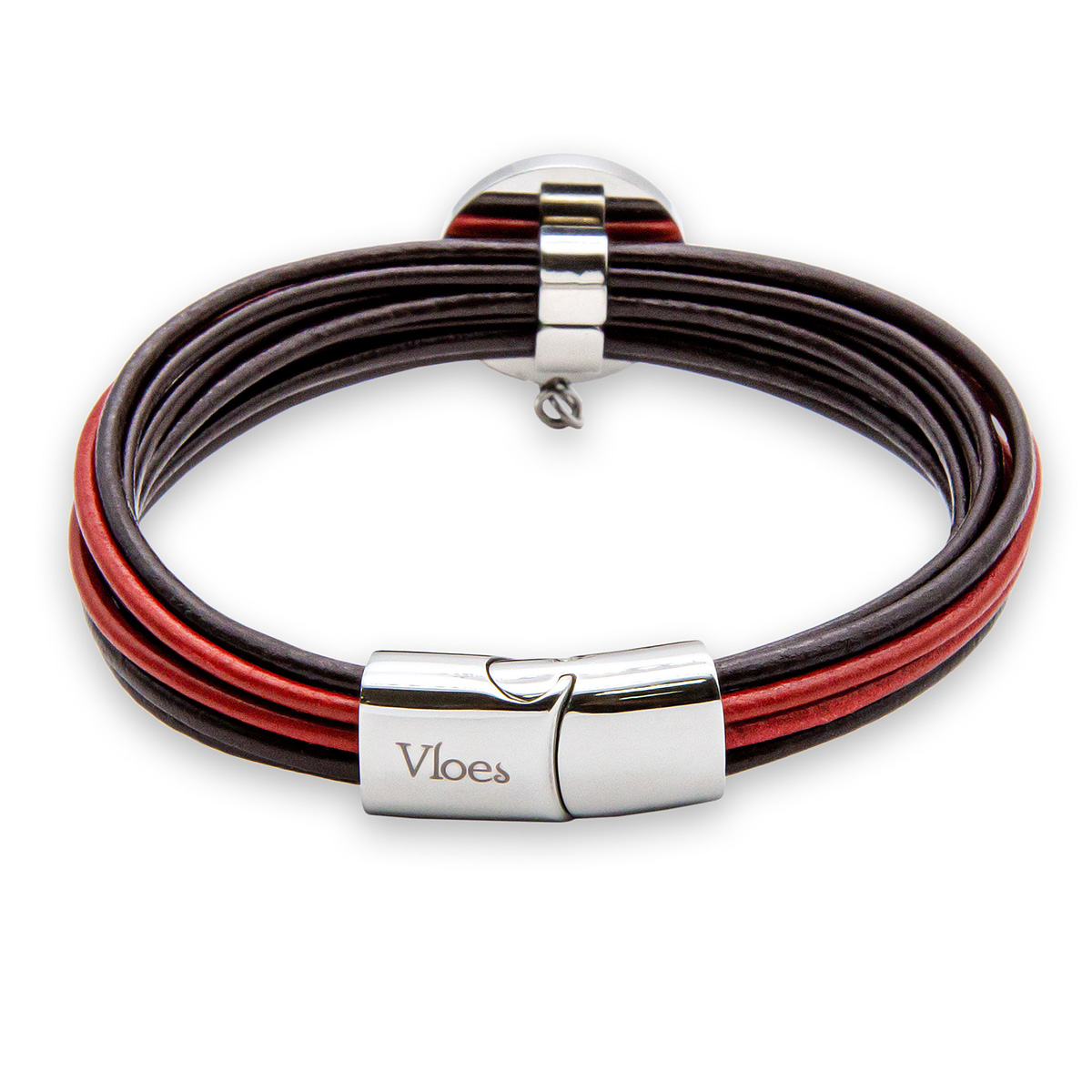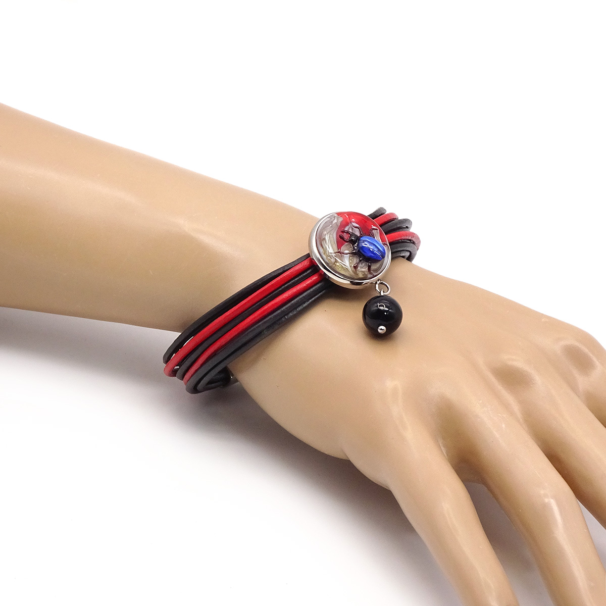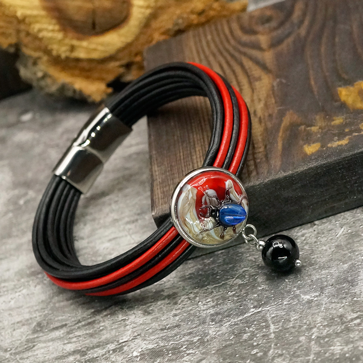 Браслет изготовлен из муранского стекла, натуральной кожи и гипоаллергенной ювелирной стали, что очень важно для людей с чувствительной кожей. Металл не темнеет и не подвергается воздействиям окружающей среды, надолго обеспечивая красивый внешний вид изделия. Крепкий магнитный замок с двойной защитой надежно фиксируется на запястье. Ширина браслета - 1,5 см. Диаметр стеклянного элемента - 2 см, шар 1 см. Вес - 22 гр.