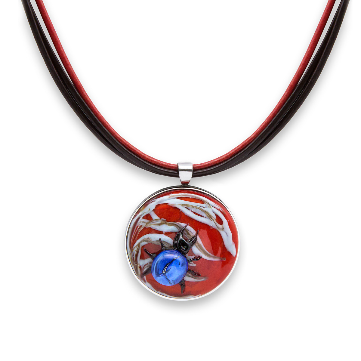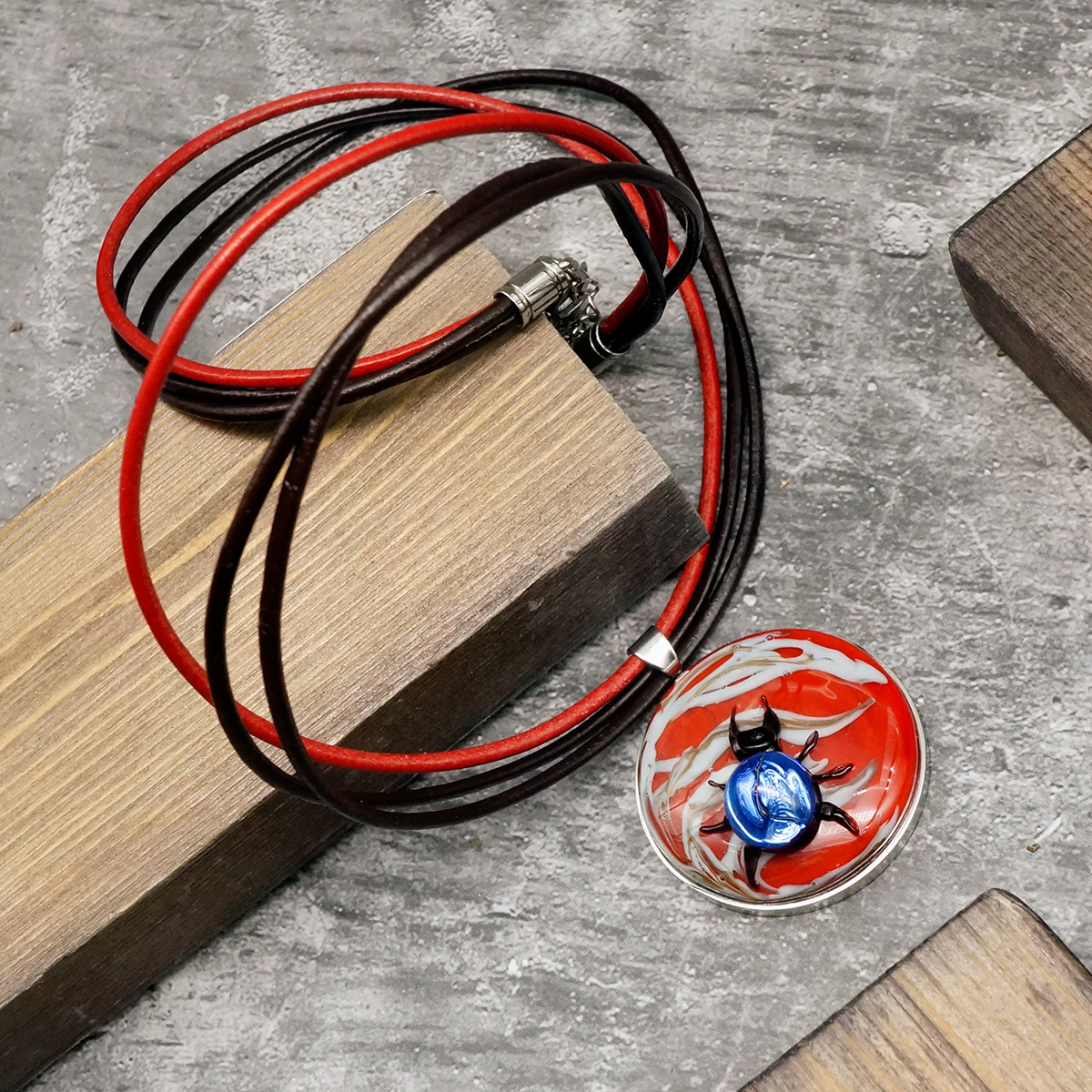 Колье изготовлено из натуральной кожи, муранского стекла и гипоаллергенной ювелирной стали, что очень важно для людей с чувствительной кожей. Металл не темнеет и не подвергается воздействиям окружающей среды, надолго обеспечивая красивый внешний вид изделия. Длина колье - 46 см + 5 см. удлиняющая цепочка. Диаметр стеклянного элемента - 3 см. Вес - 20 гр.