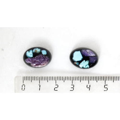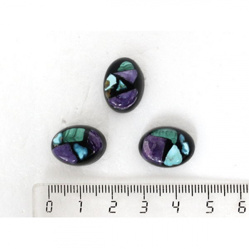 Чароит, бирюза нат., малахит, кабошон-мозаика овал 18х13мм, черный фон