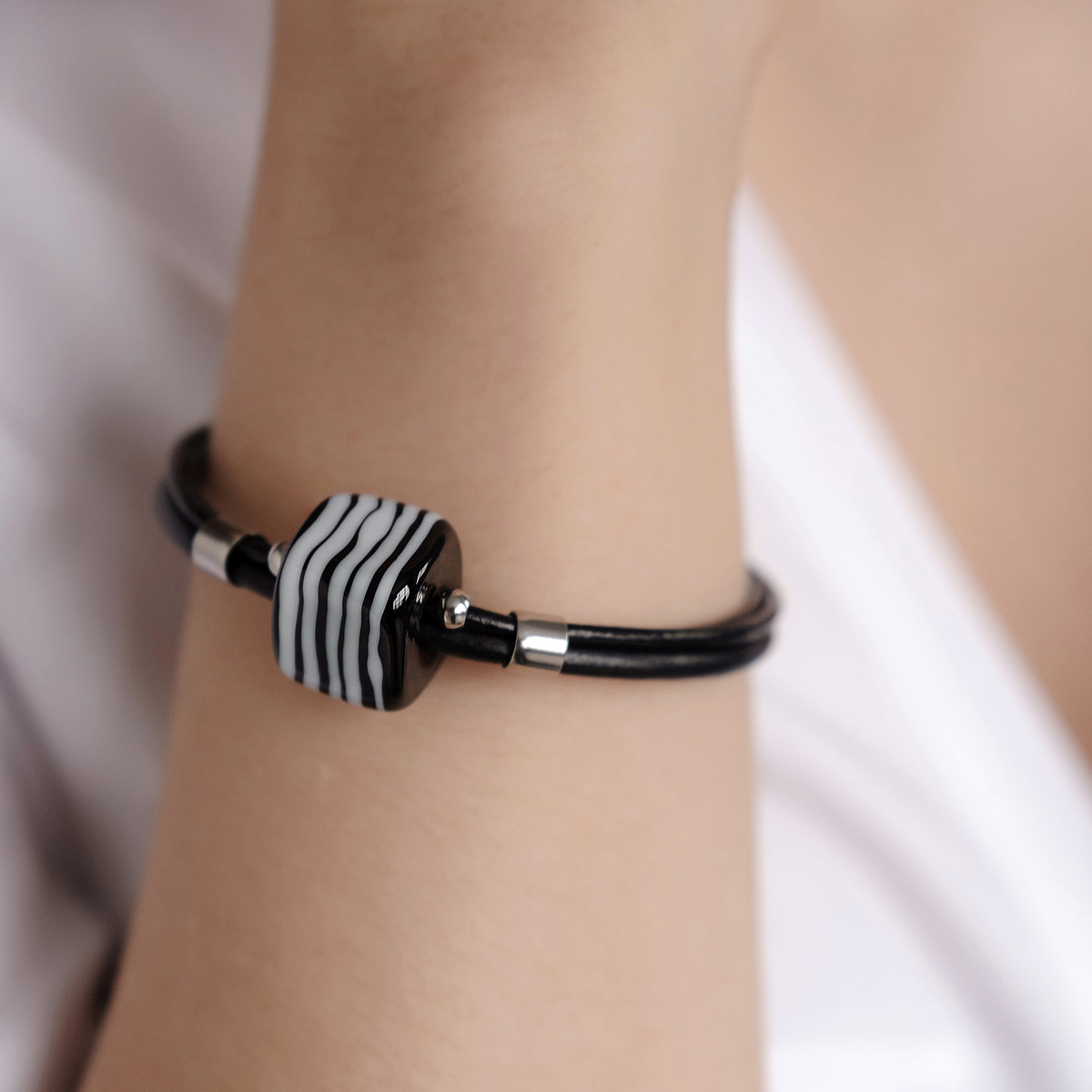 Браслет изготовлен из муранского стекла, натуральной кожи и гипоаллергенной ювелирной стали, что очень важно для людей с чувствительной кожей. Металл не темнеет и не подвергается воздействиям окружающей среды, надолго обеспечивая красивый внешний вид изделия. Крепкий магнитный замок надежно фиксируется на запястье. Ширина браслета - 0,5 см.  Размер стеклянной бусины - 1,5*1,5 см.   Вес - 19 гр.