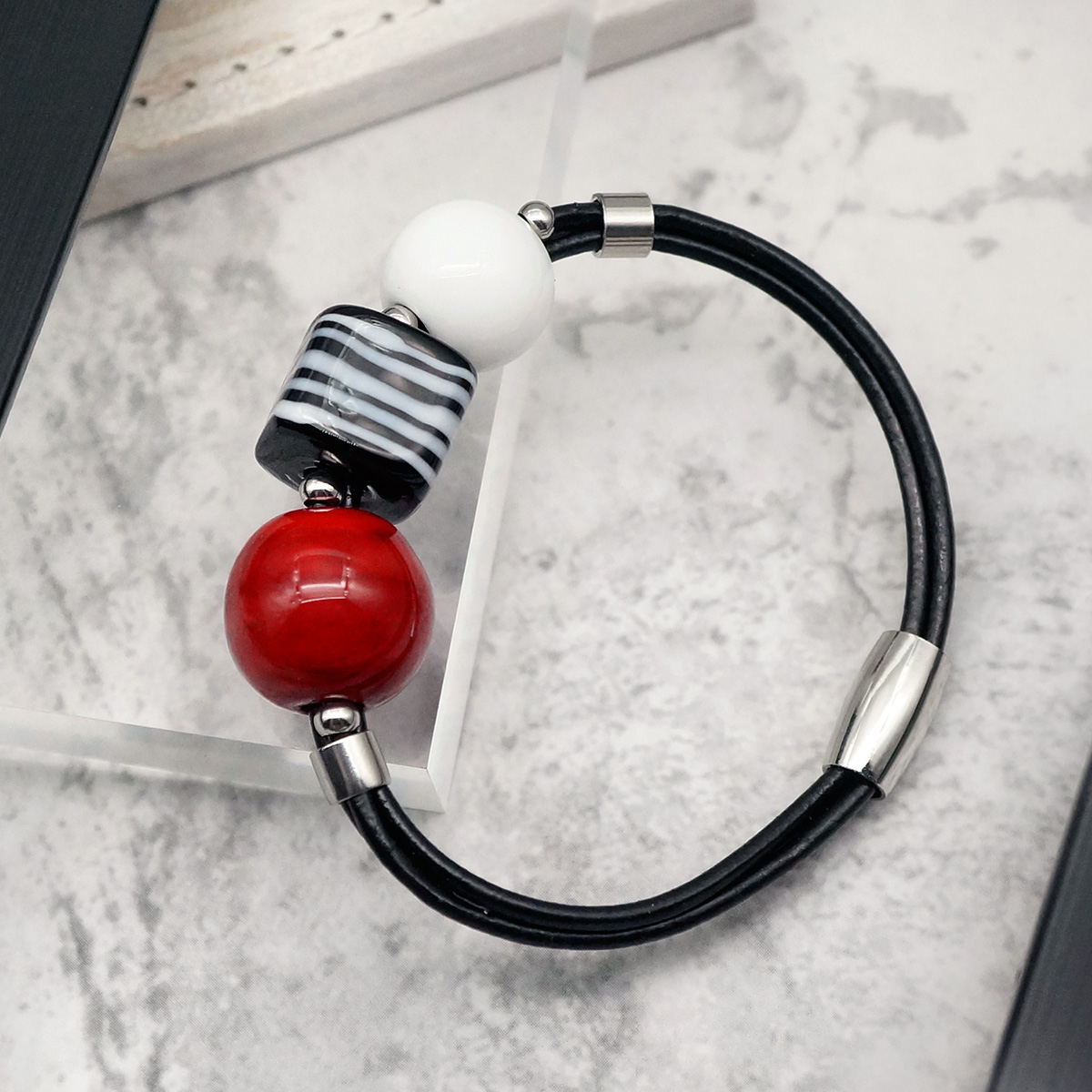 Браслет изготовлен из муранского стекла, натуральной кожи и гипоаллергенной ювелирной стали, что очень важно для людей с чувствительной кожей. Металл не темнеет и не подвергается воздействиям окружающей среды, надолго обеспечивая красивый внешний вид изделия. Крепкий магнитный замок надежно фиксируется на запястье. Ширина браслета - 0,5 см. Диаметр стеклянных шароов - 1,2 и 1,5 см. Размер куба - 1,5х1,5 см. Вес - 26 гр.