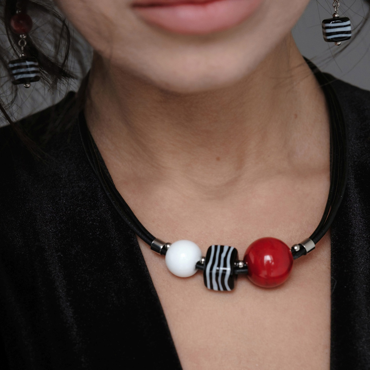 Колье изготовлено из натуральной кожи, муранского стекла и гипоаллергенной ювелирной стали, что очень важно для людей с чувствительной кожей. Металл не темнеет и не подвергается воздействиям окружающей среды, надолго обеспечивая красивый внешний вид изделия. Длина колье - 46 см + 5 см. удлиняющая цепочка. Диаметр стеклянных шароов - 2,2 и 1,5 см. Размер куба - 1,8х1,8 см. Вес - 37 гр.
