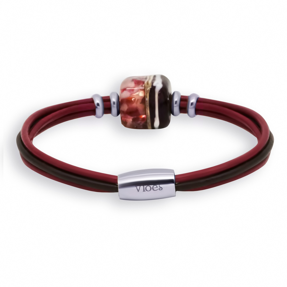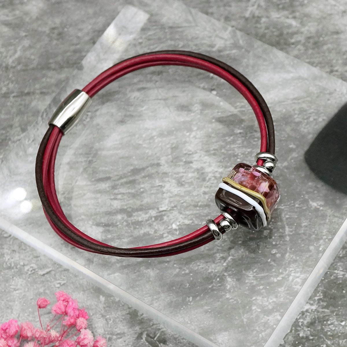 Браслет изготовлен из муранского стекла, натуральной кожи и гипоаллергенной ювелирной стали, что очень важно для людей с чувствительной кожей. Металл не темнеет и не подвергается воздействиям окружающей среды, надолго обеспечивая красивый внешний вид изделия. Крепкий магнитный замок надежно фиксируется на запястье. Ширина браслета - 0,5 см. Размер стеклянной бусины - 1,3x1,3 см. Вес - 16 гр.