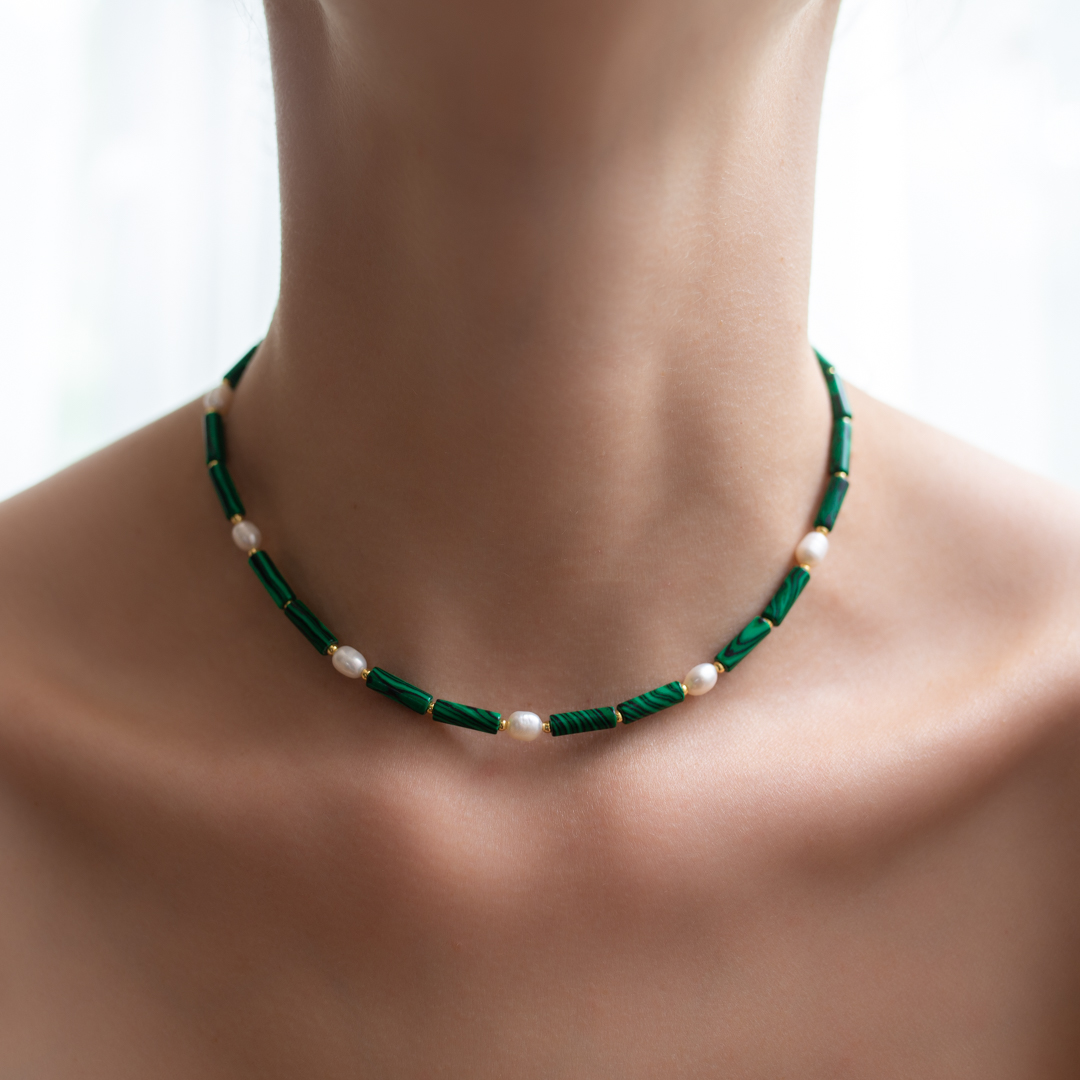 Ювелирный сплав, золочение, натуральный жемчуг, имитация малахита.