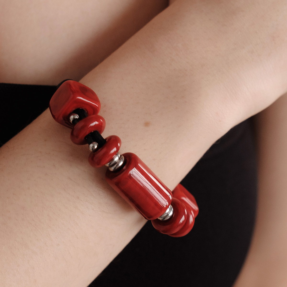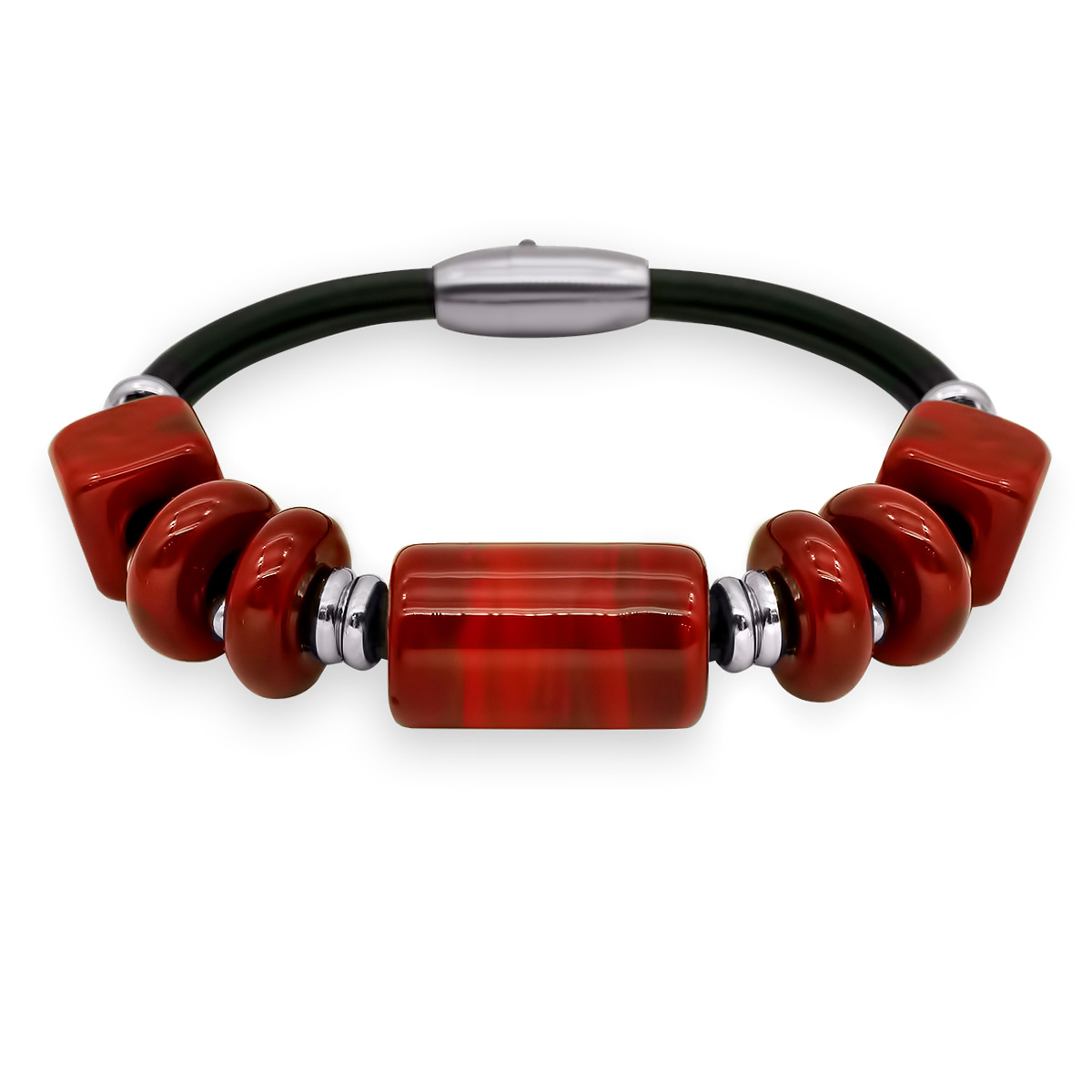 Кольцо изготовлено из муранского стекла и гипоаллергенной ювелирной стали, что очень важно для людей с чувствительной кожей. Металл не темнеет и не подвергается воздействиям окружающей среды, надолго обеспечивая красивый внешний вид изделия.  Ширина браслета 1,5 см. Размер кубышки 2,2*1,2 см, кубов 1,2*1,2 см, рандели 1,4*0,5 см. Вес - 32 гр.