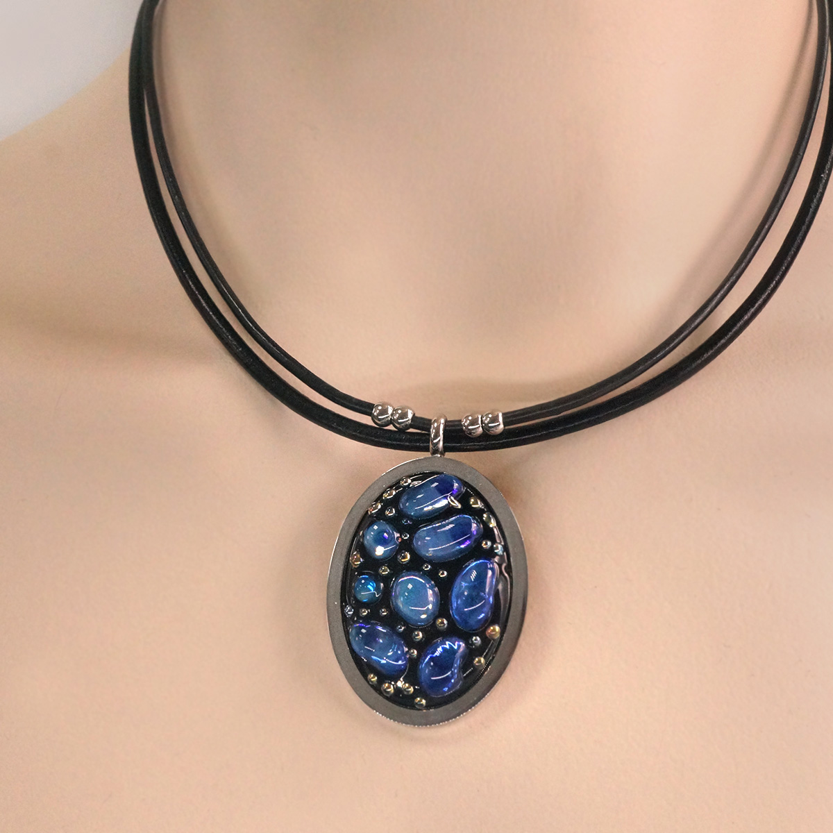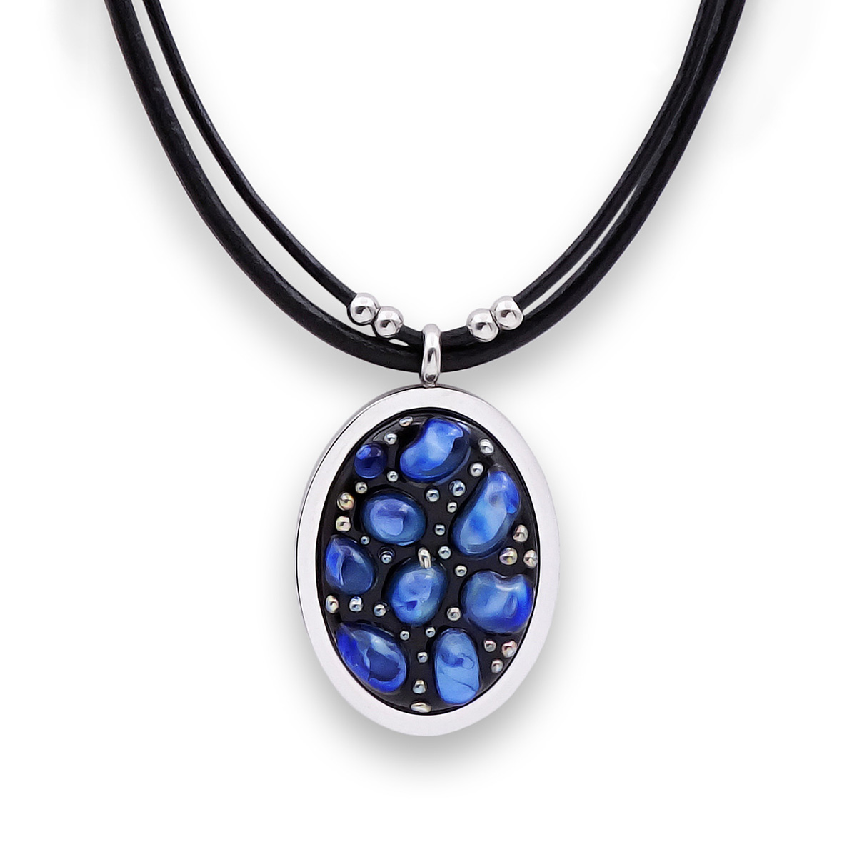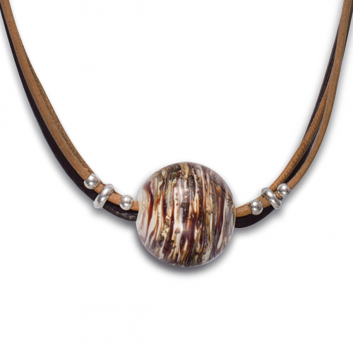 Колье изготовлено из натуральной кожи, муранского стекла и гипоаллергенной ювелирной стали, что очень важно для людей с чувствительной кожей. Металл не темнеет и не подвергается воздействиям окружающей среды, надолго обеспечивая красивый внешний вид изделия. Длина колье - 46 см + 5 см. удлиняющая цепочка. Размер стеклянного элемента - 4х3 см. Вес - 24 гр.