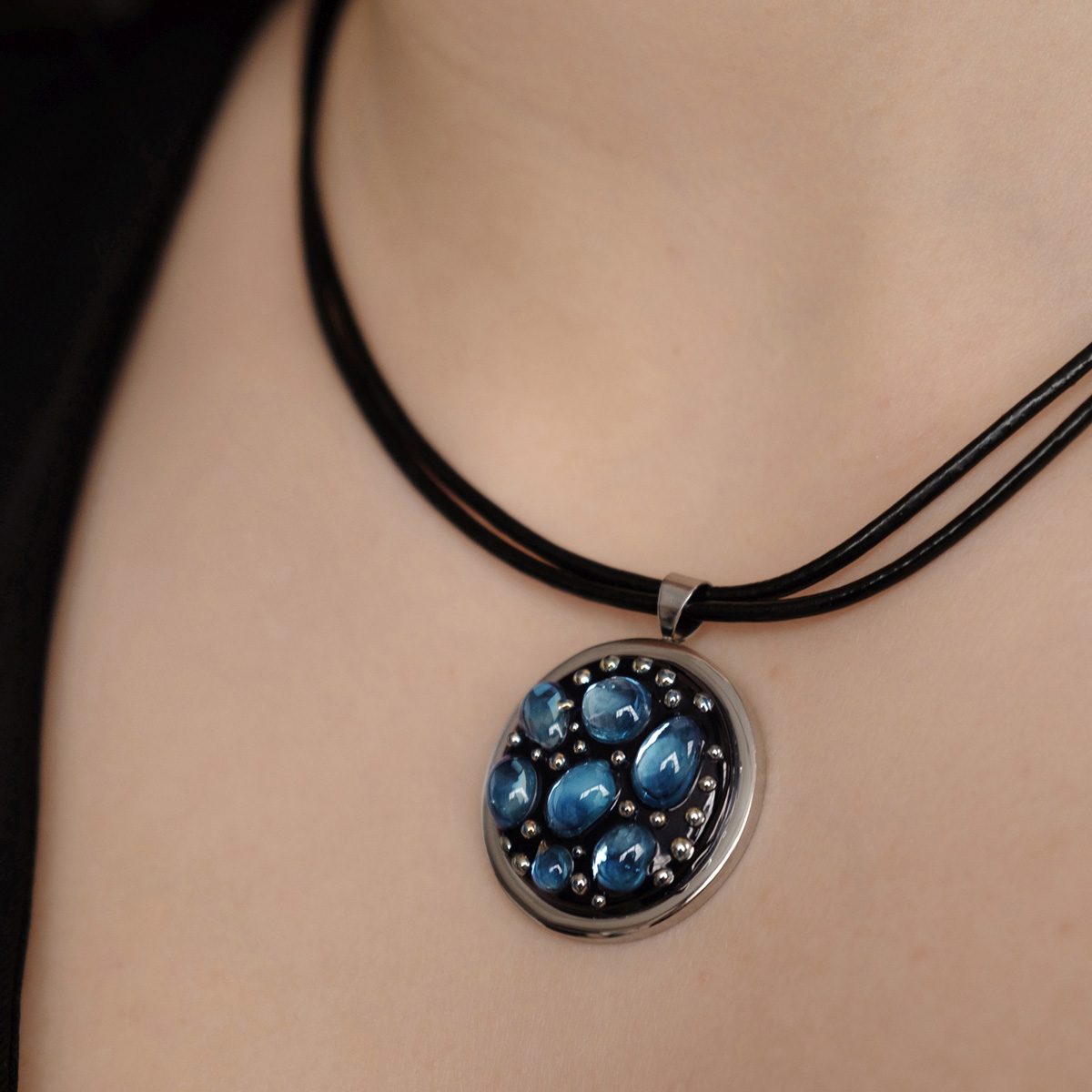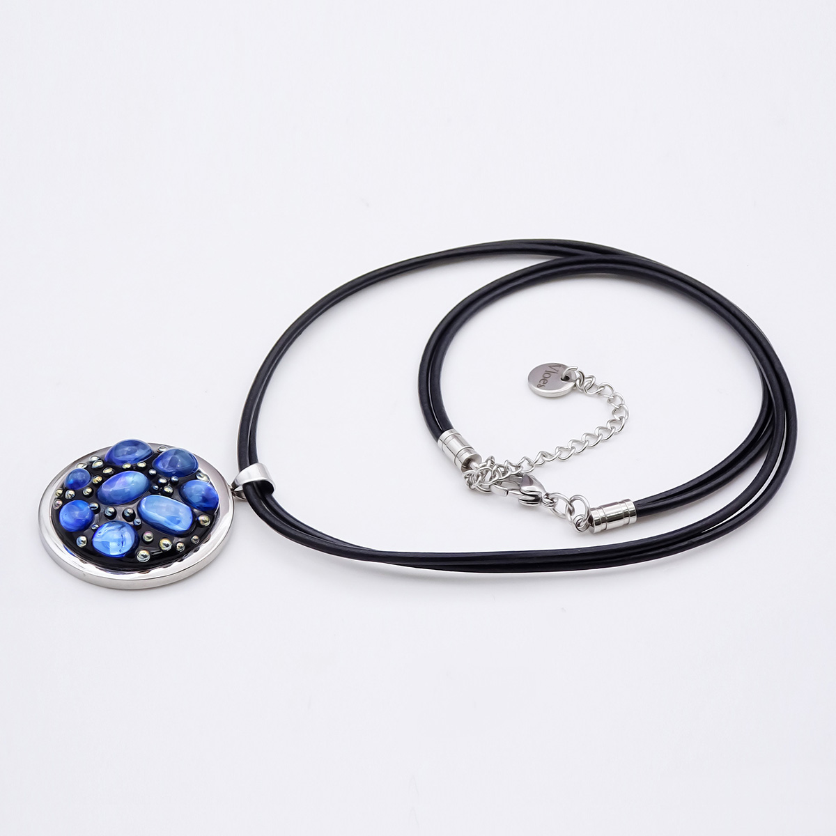 Колье изготовлено из натуральной кожи, муранского стекла и гипоаллергенной ювелирной стали, что очень важно для людей с чувствительной кожей. Металл не темнеет и не подвергается воздействиям окружающей среды, надолго обеспечивая красивый внешний вид изделия. Длина колье - 46 см + 5 см. удлиняющая цепочка. Диаметр стеклянного элемента - 2,5 см. Вес - 19 гр.