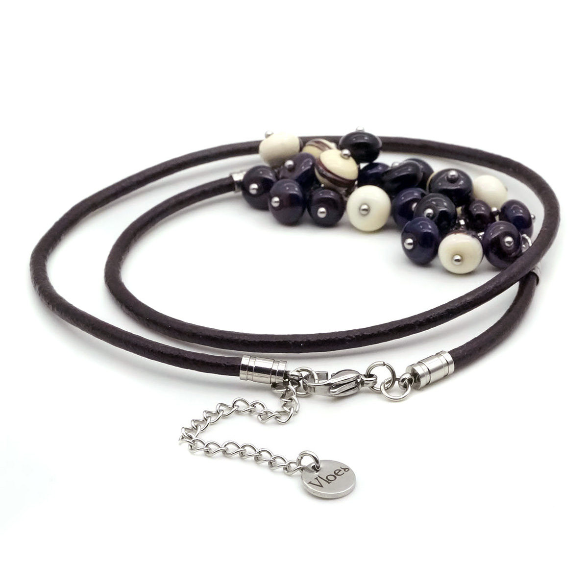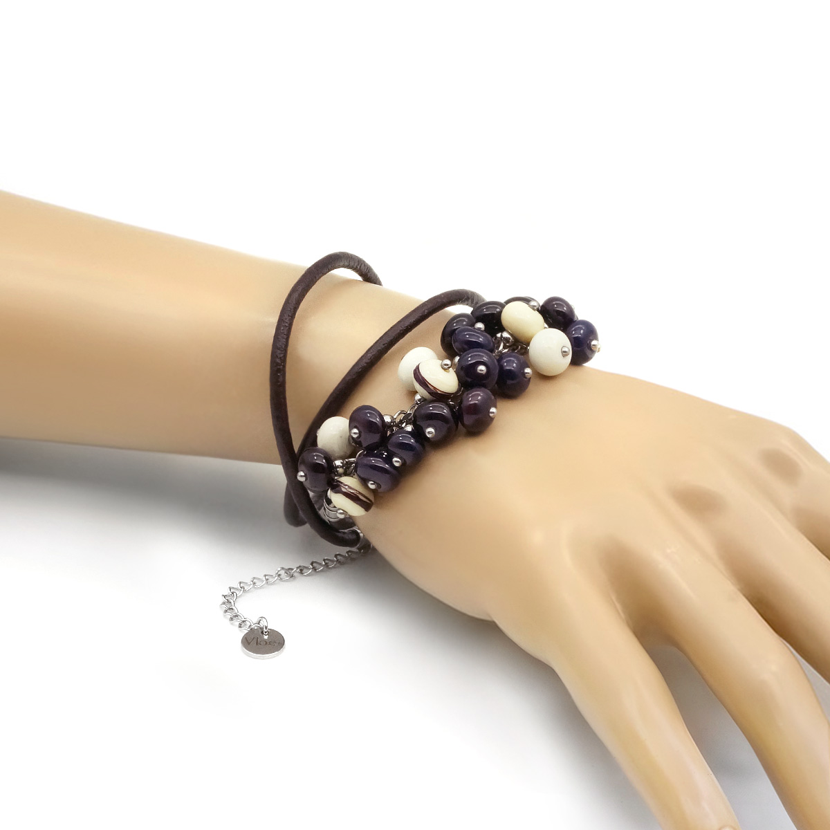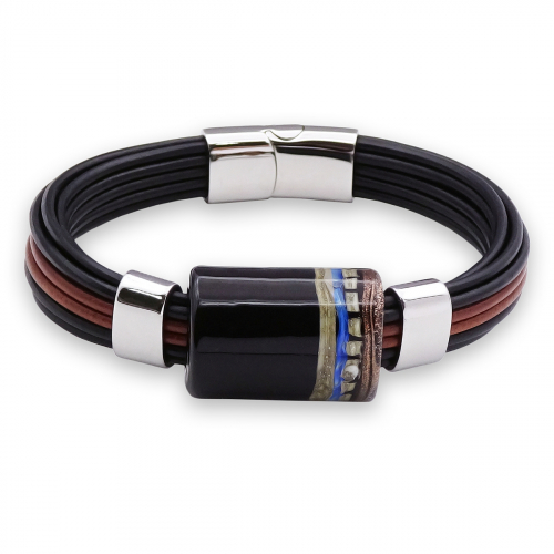 Браслет изготовлен из муранского стекла, натуральной кожи и гипоаллергенной ювелирной стали, что очень важно для людей с чувствительной кожей. Металл не темнеет и не подвергается воздействиям окружающей среды, надолго обеспечивая красивый внешний вид изделия. Застежка - карабин надежно фиксируется на запястье. Ширина браслета - 1 см. Размер стеклянных бусин - 0,5 см. Вес - 19 гр.
