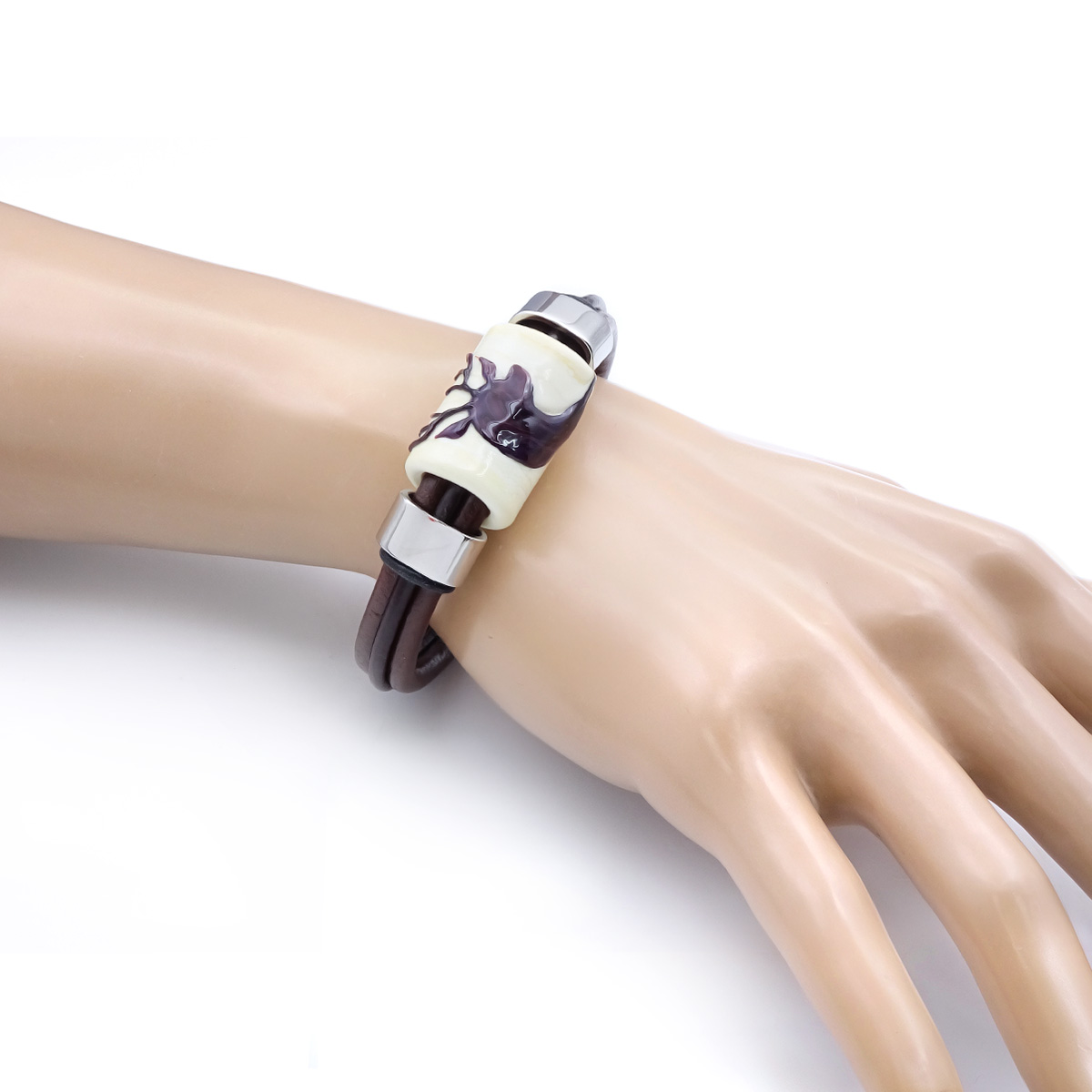 Браслет изготовлен из муранского стекла, натуральной кожи и гипоаллергенной ювелирной стали, что очень важно для людей с чувствительной кожей. Металл не темнеет и не подвергается воздействиям окружающей среды, надолго обеспечивая красивый внешний вид изделия. Крепкий магнитный замок с двойной защитой надежно фиксируется на запястье. Ширина браслета - 1,5 см. Размер стеклянной бусины - 1,9x2,5 см. Вес - 30 гр.