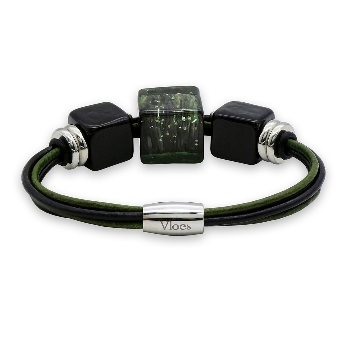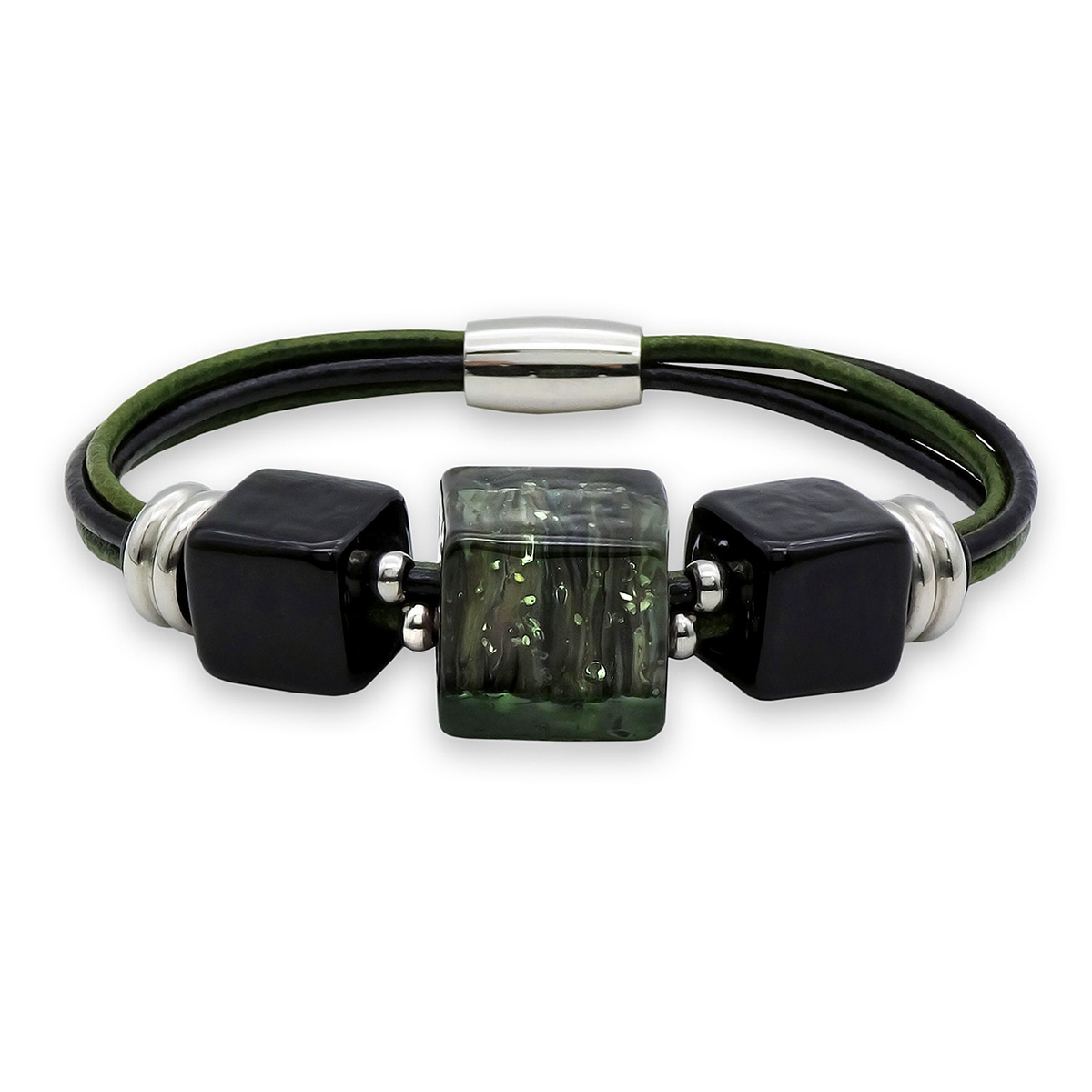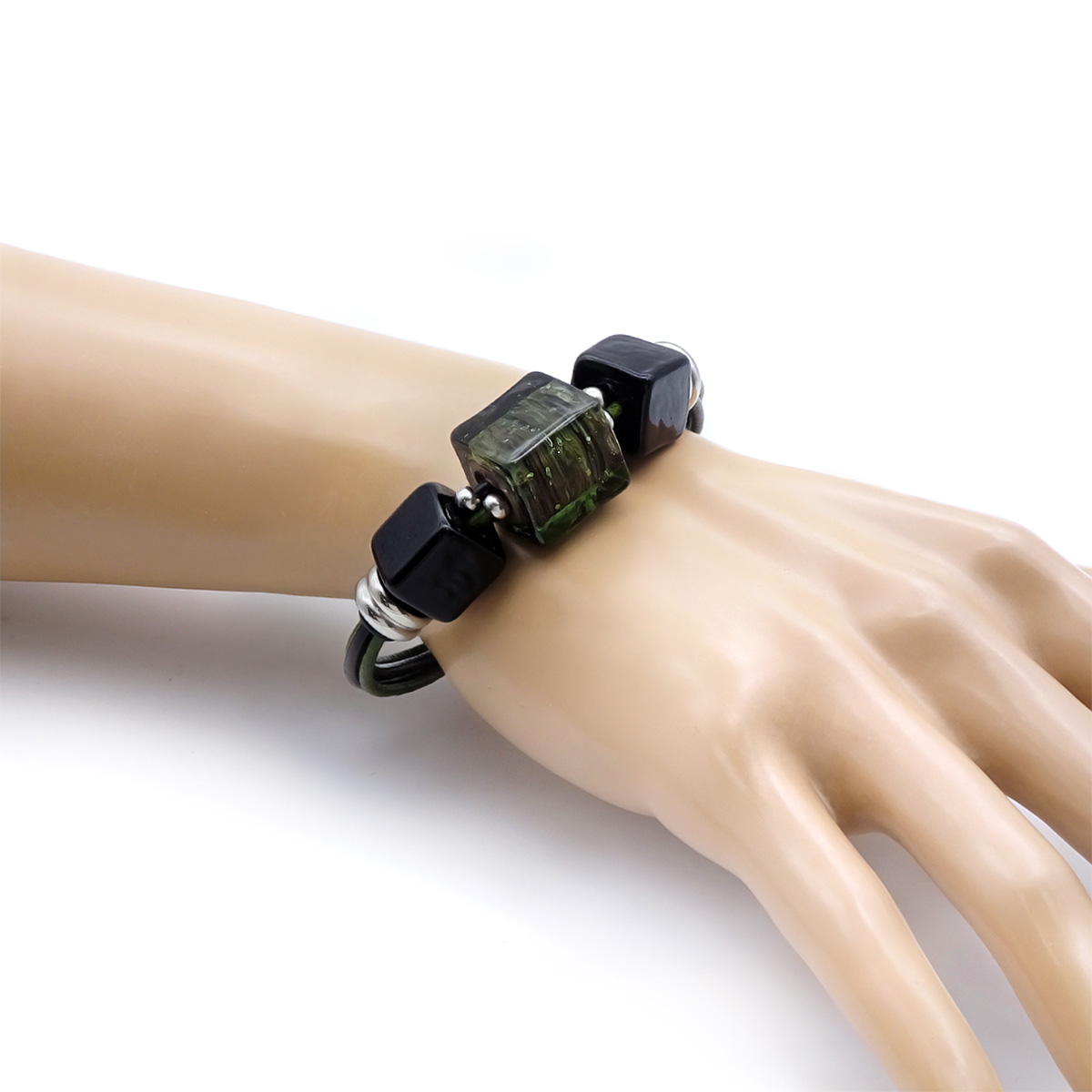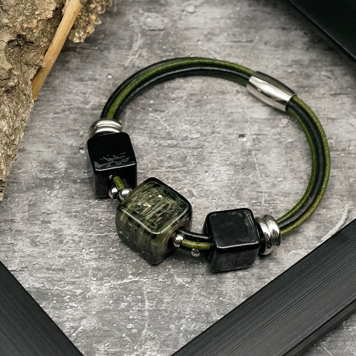 Браслет изготовлен из муранского стекла, натуральной кожи и гипоаллергенной ювелирной стали, что очень важно для людей с чувствительной кожей. Металл не темнеет и не подвергается воздействиям окружающей среды, надолго обеспечивая красивый внешний вид изделия. Крепкий магнитный замок надежно фиксируется на запястье. Ширина браслета - 0,5 см. Размер стеклянных кубов - 1,5*1,5 см и 1,2*1,2 см. Вес - 29 гр.