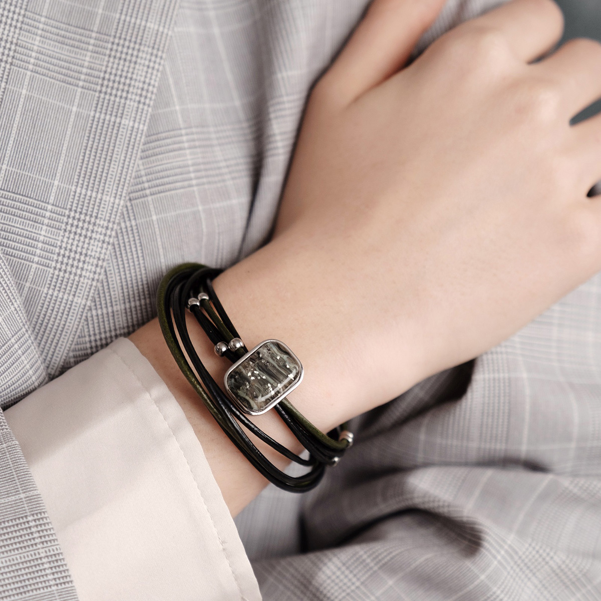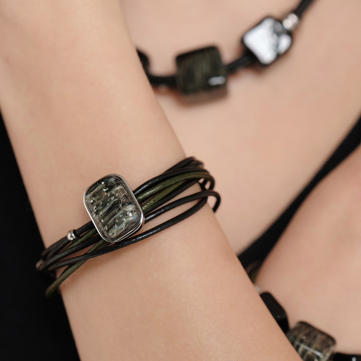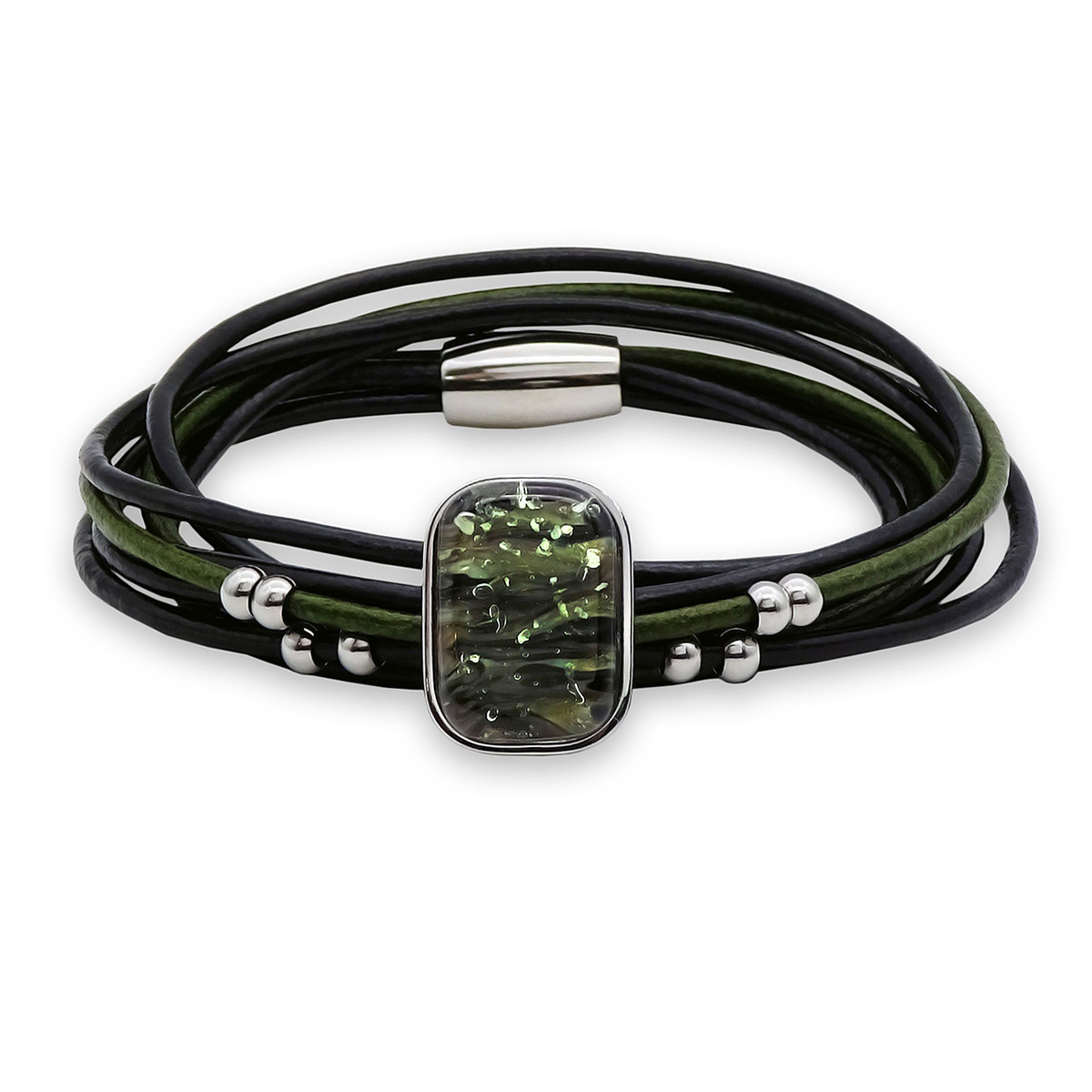 Браслет изготовлен из муранского стекла, натуральной кожи и гипоаллергенной ювелирной стали, что очень важно для людей с чувствительной кожей. Металл не темнеет и не подвергается воздействиям окружающей среды, надолго обеспечивая красивый внешний вид изделия. Крепкий магнитный замок надежно фиксируется на запястье. Ширина браслета - 1 см. Размер стеклянного элемента - 2*1,5 см. Вес - 15 гр.